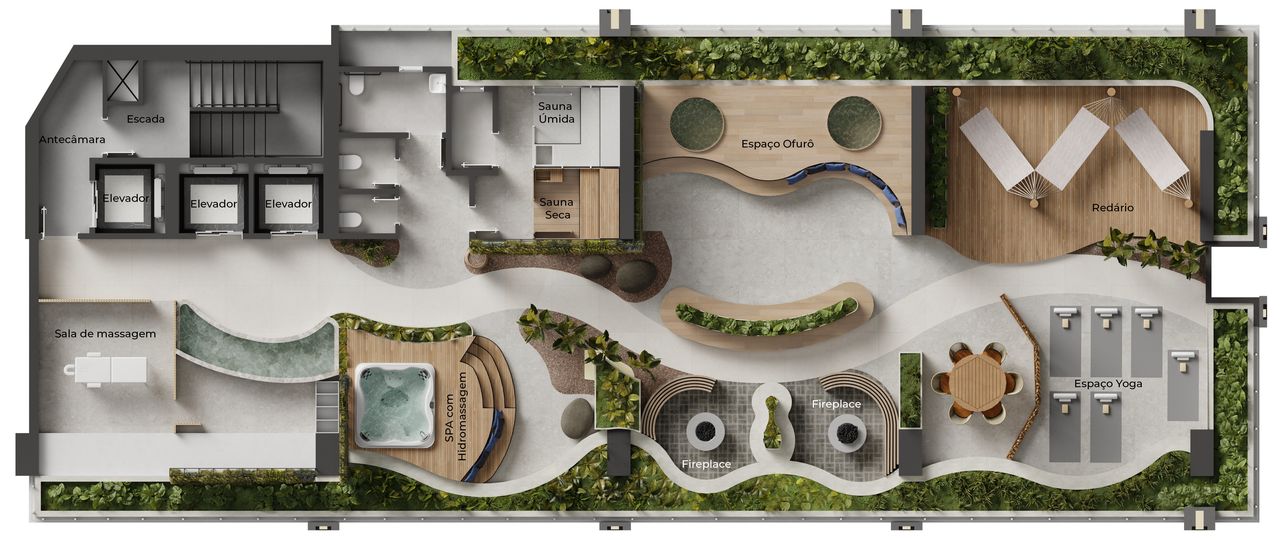 O jardim suspenso inclui spa com hidromassagem, saunas seca e úmida, espaço ofurô, sala de massagem e redário.