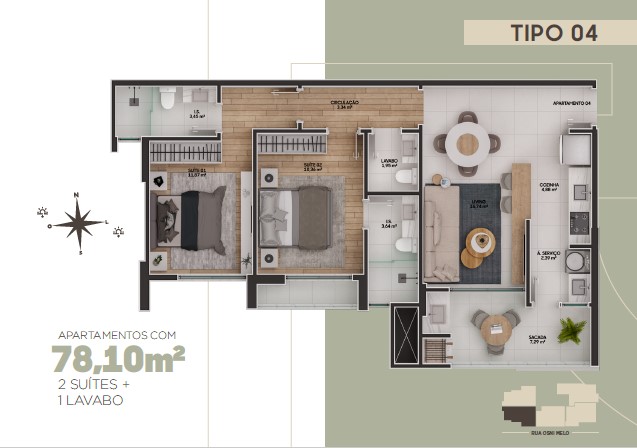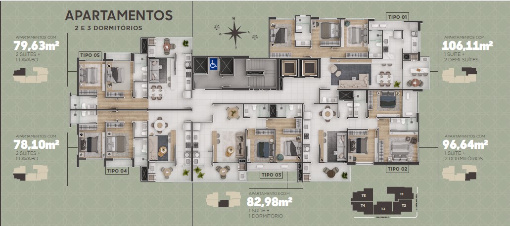 As plantas variam de 78 m² a 106 m², com opções de 2 a 3 dormitórios, até 3 suítes, varandas e integração entre os ambientes.