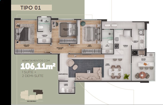 | Apartamento | R$ 1.284.000,00 | 106 m² | 3 | 3 | 2 |