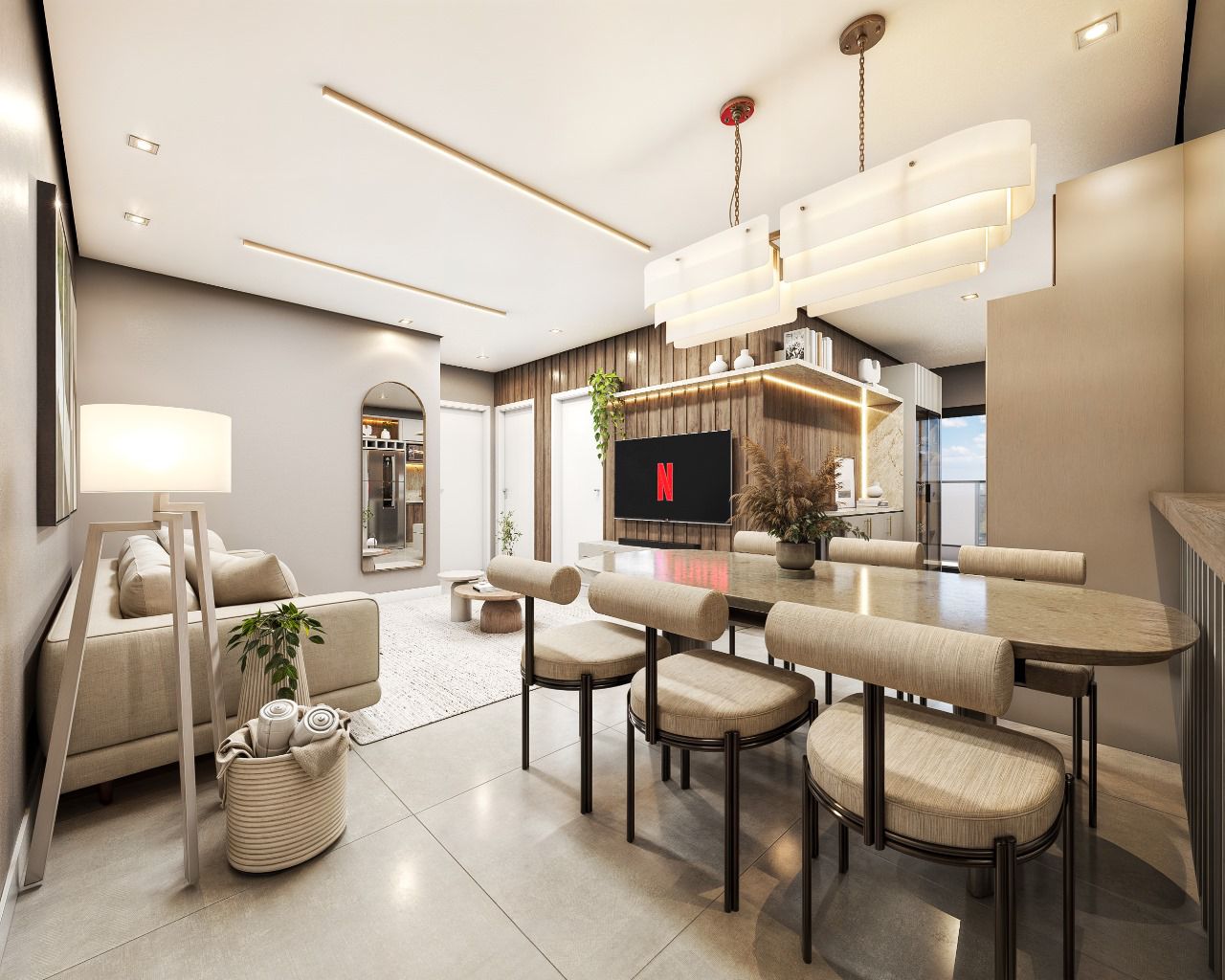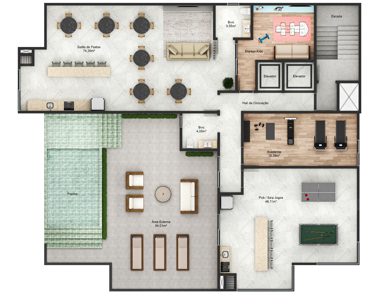 Com metragens entre 75,15 m² e 83,69 m², o Residencial Revine Lago oferece plantas funcionais, acabamentos em porcelanato e gesso rebaixado, além de portas laqueadas e fechadura eletrônica. Os ambientes integrados valorizam a ventilação natural e a iluminação. O condomínio oferece uma experiência completa de lazer com piscina, salão de festas, pub, academia e rooftop.