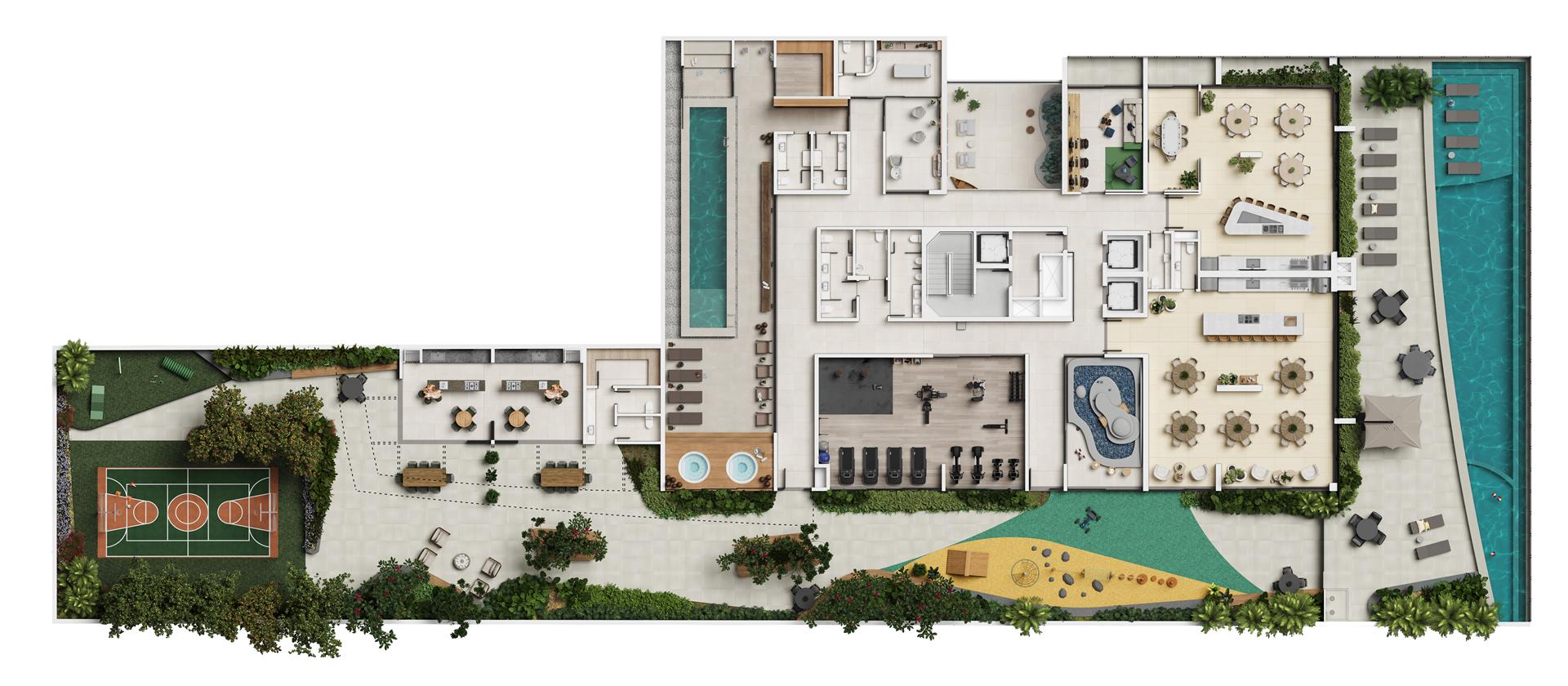 O paisagismo é de Eduardo Soares e o projeto de interiores é assinado pela Casabá Criativos, garantindo harmonia e elegância em todos os espaços.