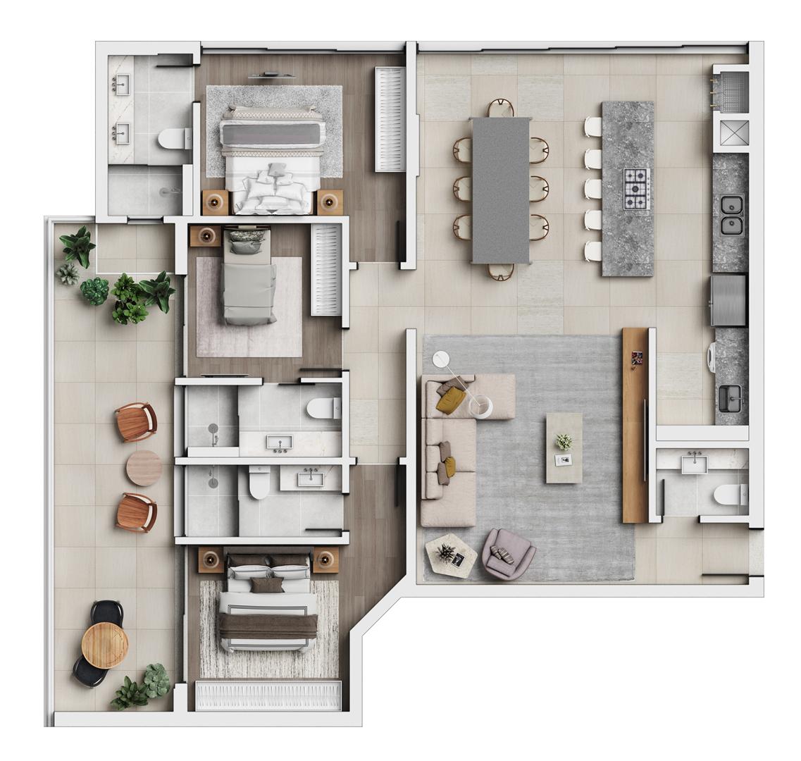 As unidades Garden, denominadas Giardinos, oferecem áreas amplas com terraços integrados ao living e à cozinha gourmet com churrasqueira a carvão. Com metragens equivalentes às plantas tipo, garantem a sensação de uma casa em meio à estrutura de um condomínio de alto padrão.