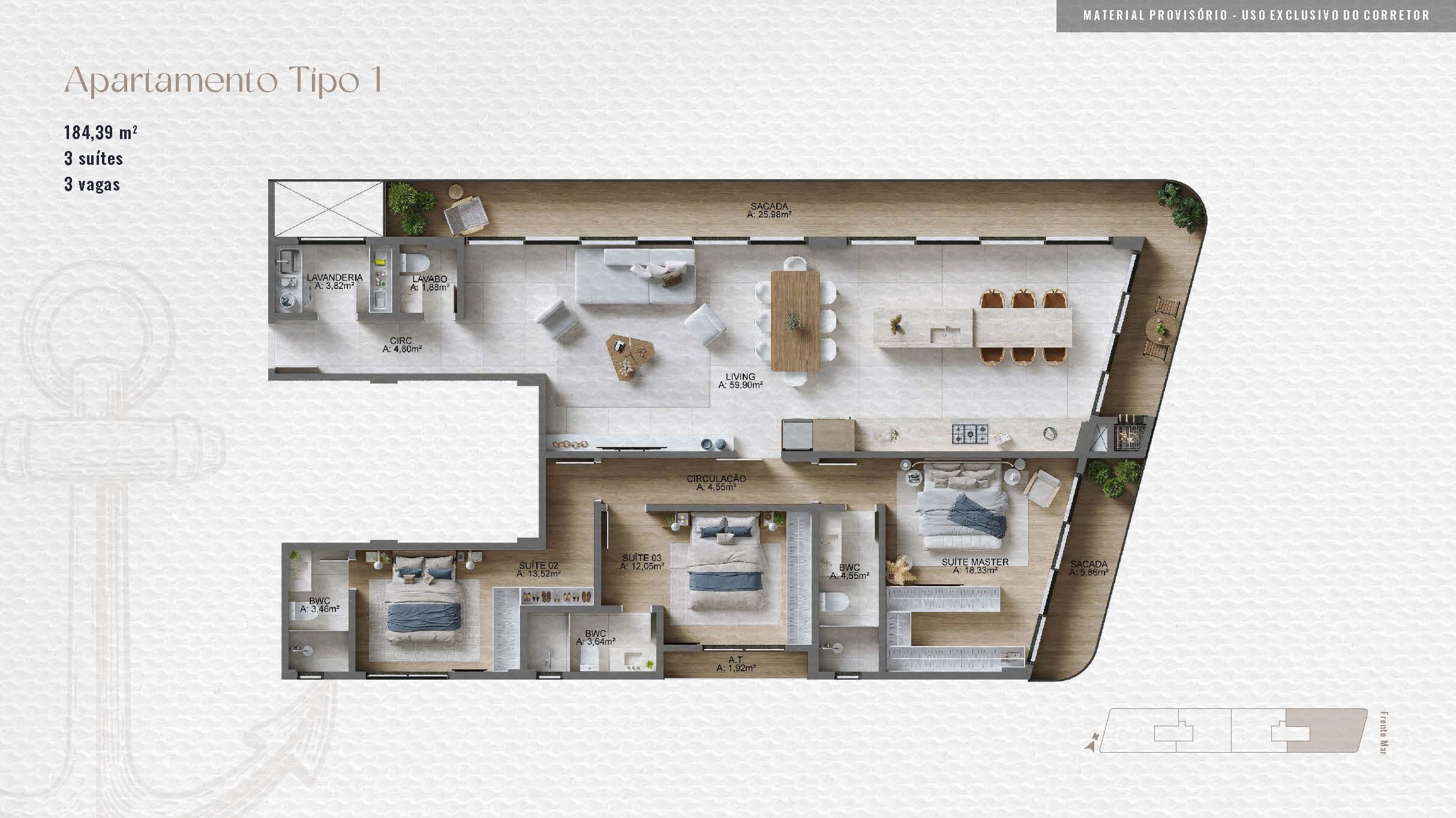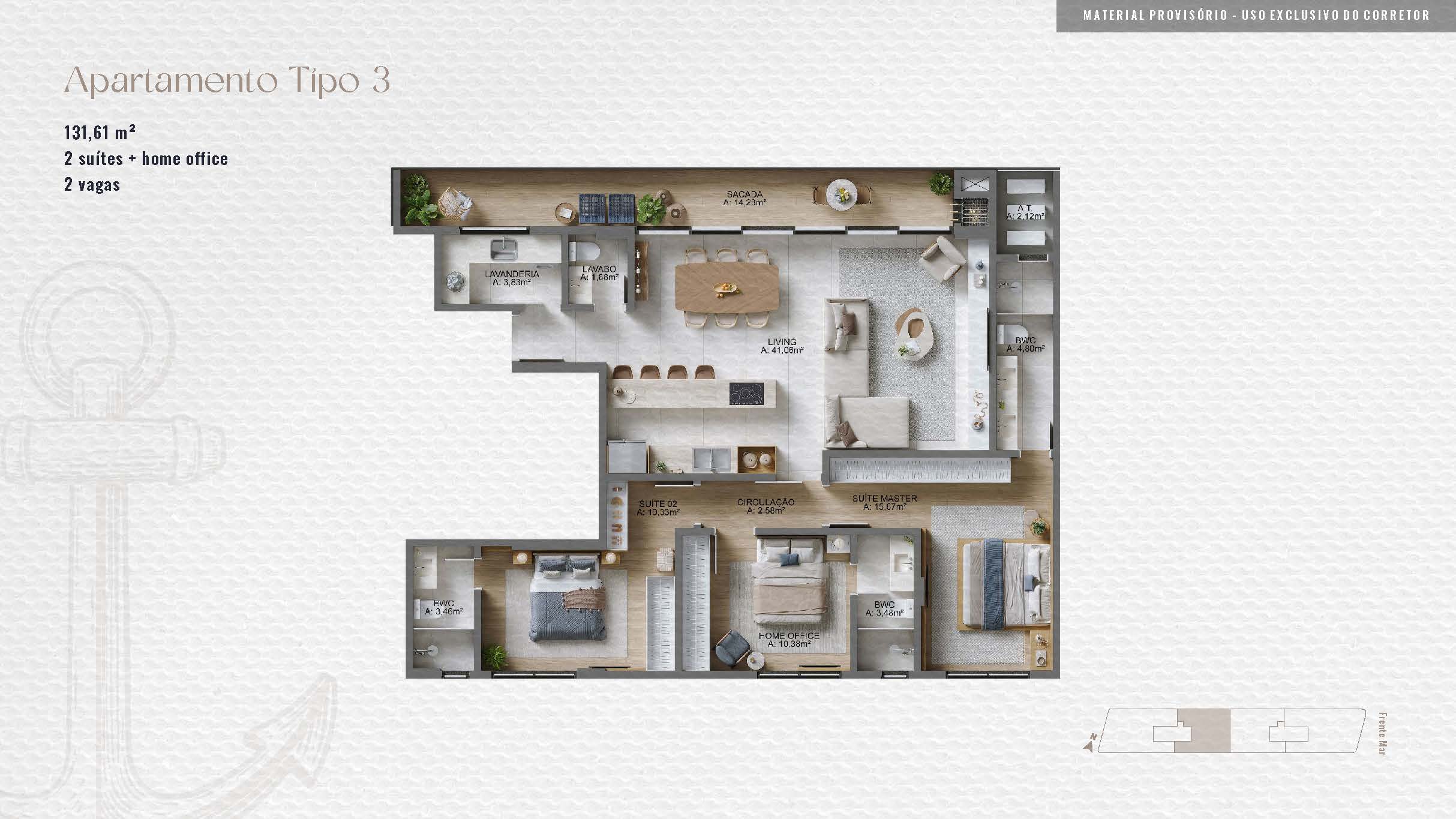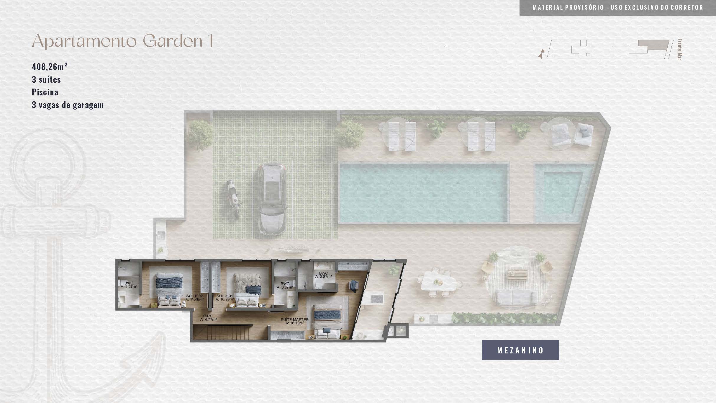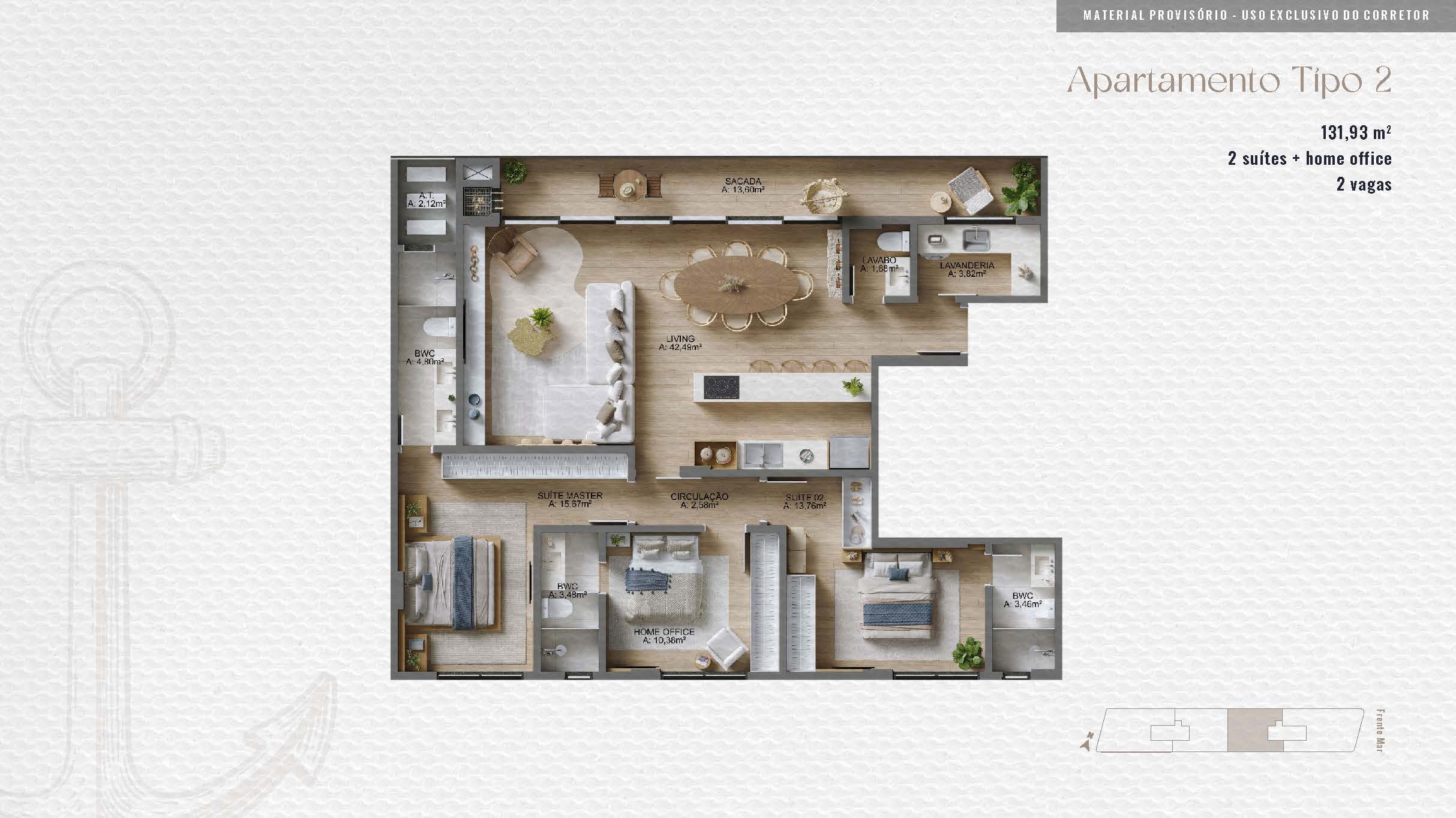 O Sailor’s Bay apresenta 29 unidades exclusivas entre apartamentos, gardens e cobertura duplex, com metragens de 131 m² a 408 m², 2 suítes + home office ou 3 a 4 suítes, e 2 a 4 vagas de garagem, combinando vista panorâmica, personalização de layout e lazer completo em Cabeçudas, Itajaí. Localizado no endereço Rua Juvêncio Tavares D’Amaral, 112 e responsabilidade da construtora ABF & VACCARO Luxury Realty.