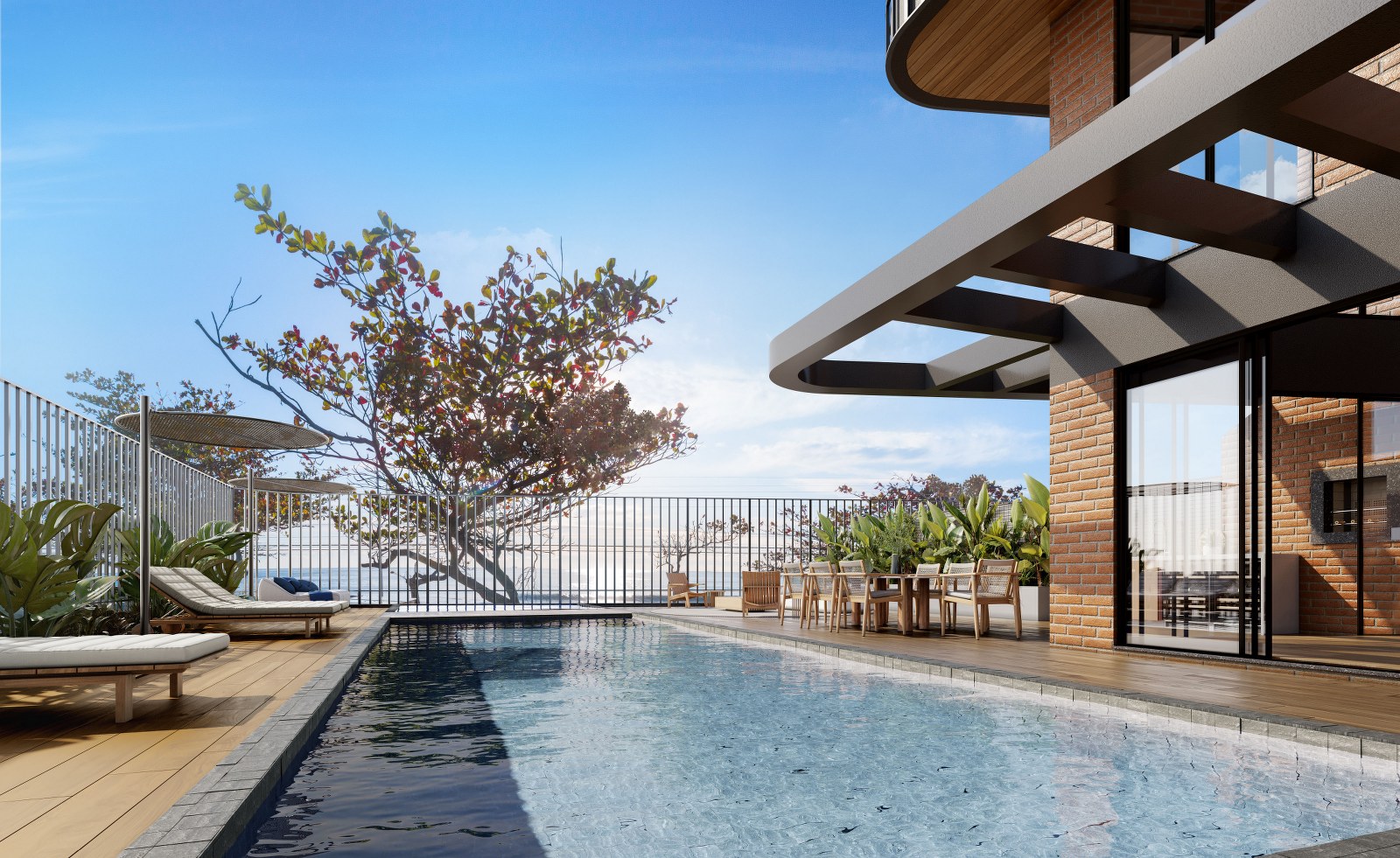 A cobertura duplex possui 346 m², 4 suítes, piscina privativa e 4 vagas, reunindo terraços para receber, vista panorâmica e integração social com gourmet. Projeto permite personalização de acabamentos e interiores, mantendo infraestrutura completa para conforto térmico e hidráulico.