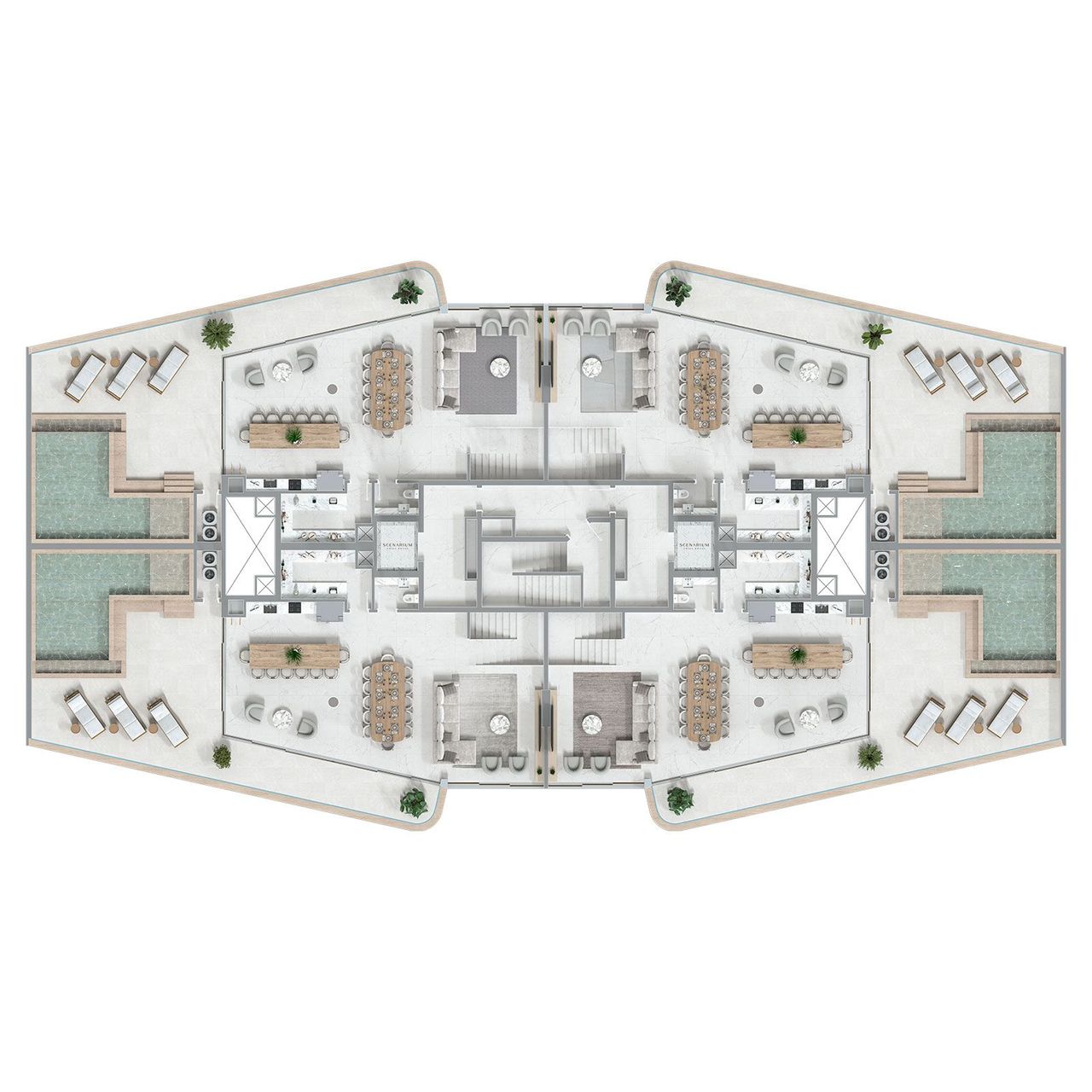 As coberturas do Scenarium Brava Norte incluem opções duplex de 378 m² com 4 suítes e também versões maiores de 562 m² com 5 suítes, ambas com piscina e espaços gourmet. A mega cobertura frente mar possui 591 m², 4 suítes, terraço amplo, piscina e churrasqueira a carvão. Todas as unidades contam com acabamentos premium, varandas extensas e vistas privilegiadas da Praia Brava.