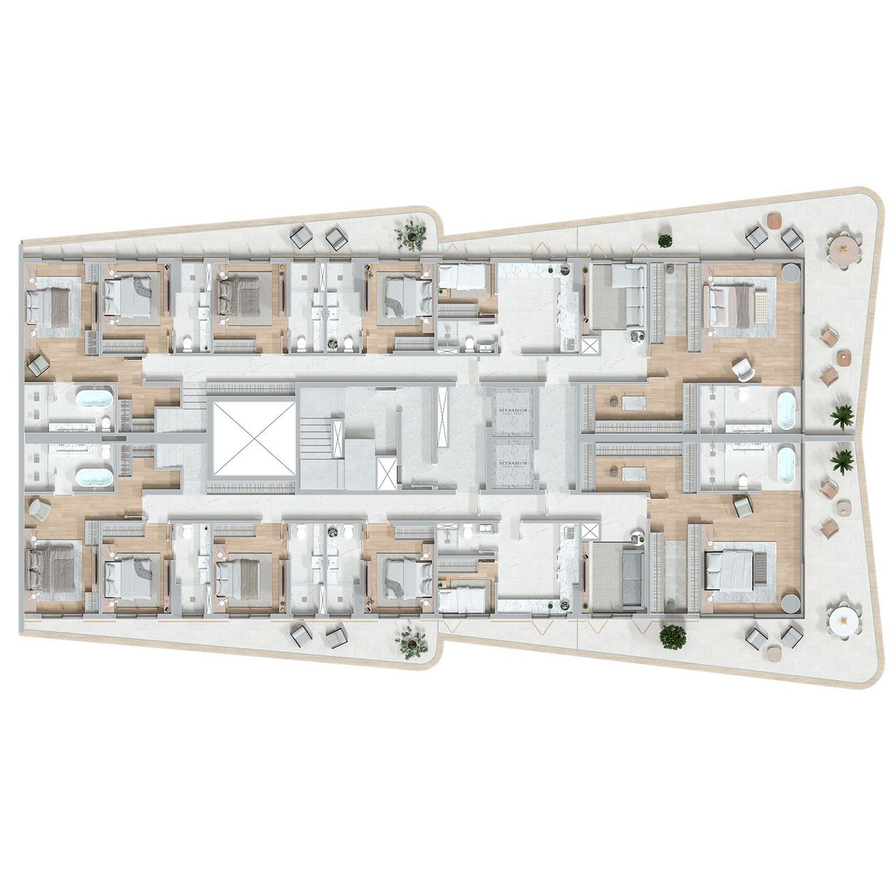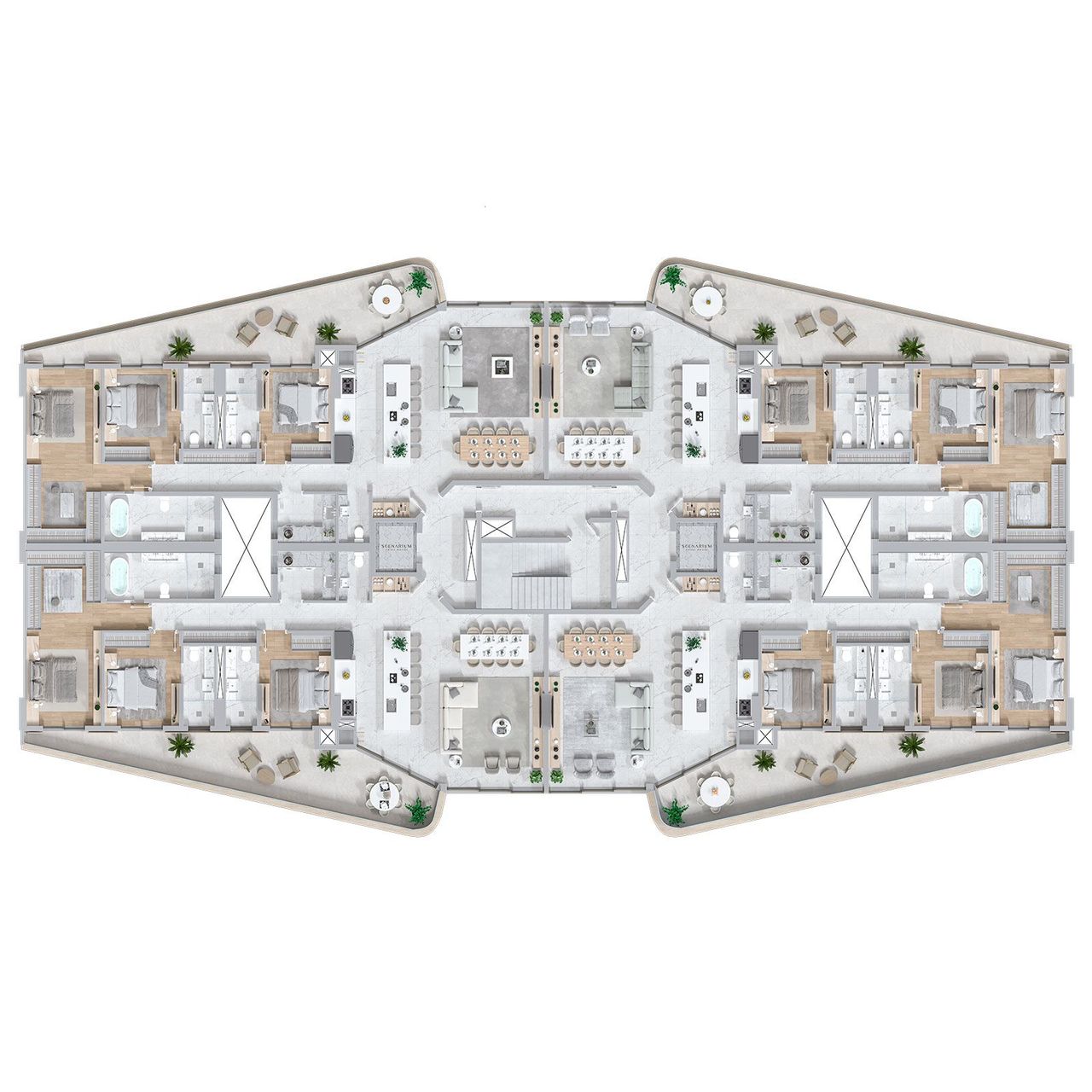 O Scenarium Brava Norte apresenta 104 unidades distribuídas entre apartamentos tipo de 189 m² com 3 suítes, mansões suspensas de 281 m² com 4 suítes, coberturas duplex de 378 m² e 562 m² com até 5 suítes, duplex garden entre 470 m² e 629 m² com 4 suítes e a mega cobertura de 591 m². Todas as unidades contam com 3 a 4 vagas de garagem, amplas varandas, áreas privativas diferenciadas e acabamentos de alto padrão, além de estrutura completa de lazer.
