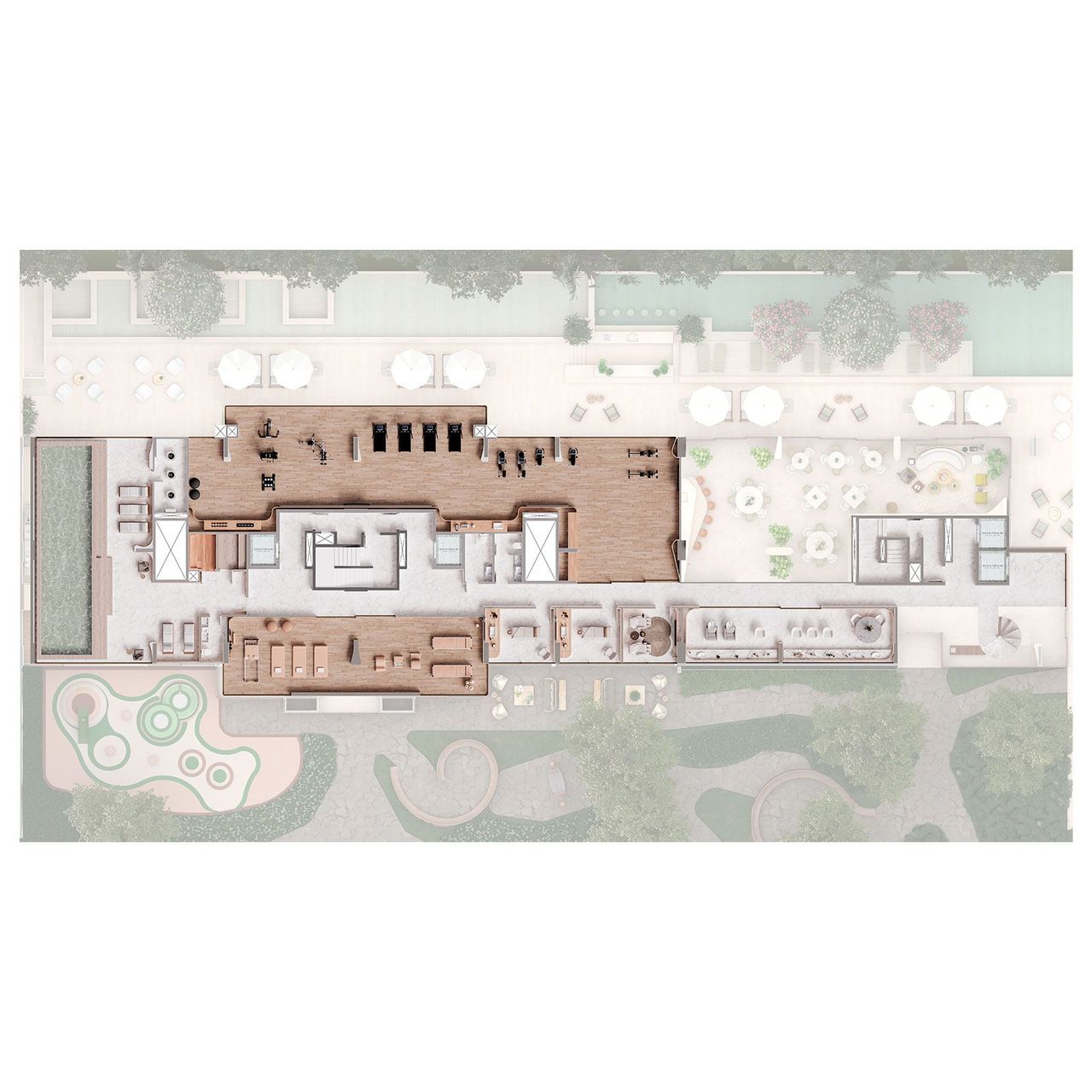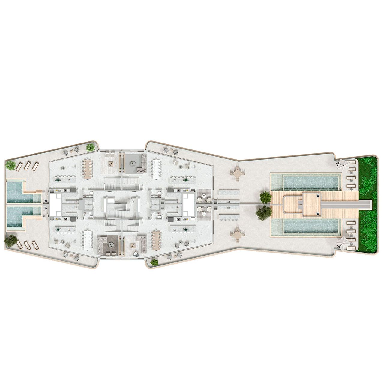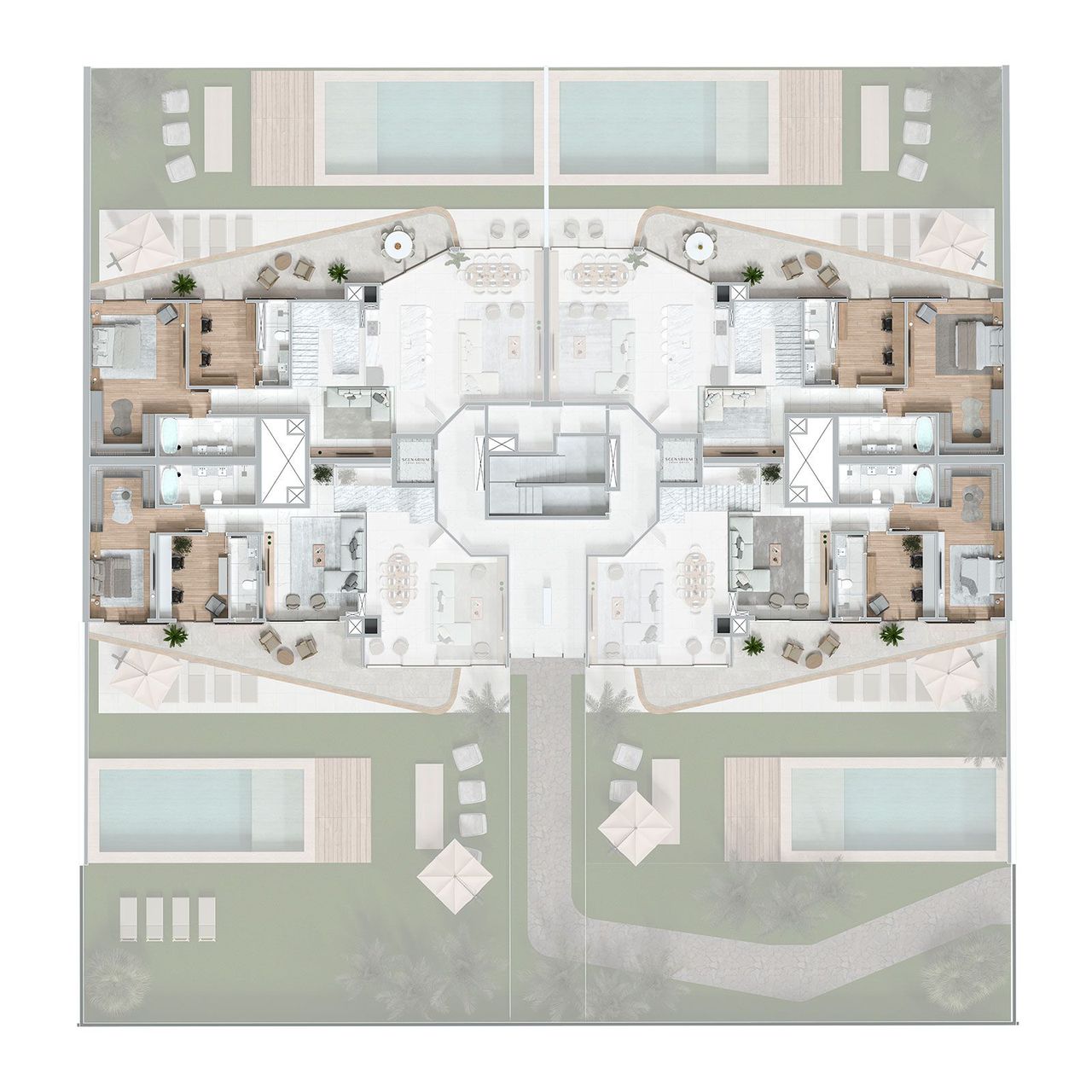 Os duplex garden do Scenarium Brava Norte variam entre 470 m² e 629 m², todos com 4 suítes e áreas amplas que incluem jardim privativo e piscina com raia. Os ambientes valorizam a integração e recebem iluminação natural abundante, mantendo acabamentos de alto padrão. Cada unidade traz churrasqueira a carvão e espaços generosos, proporcionando sensação de casa com o conforto de um condomínio vertical.