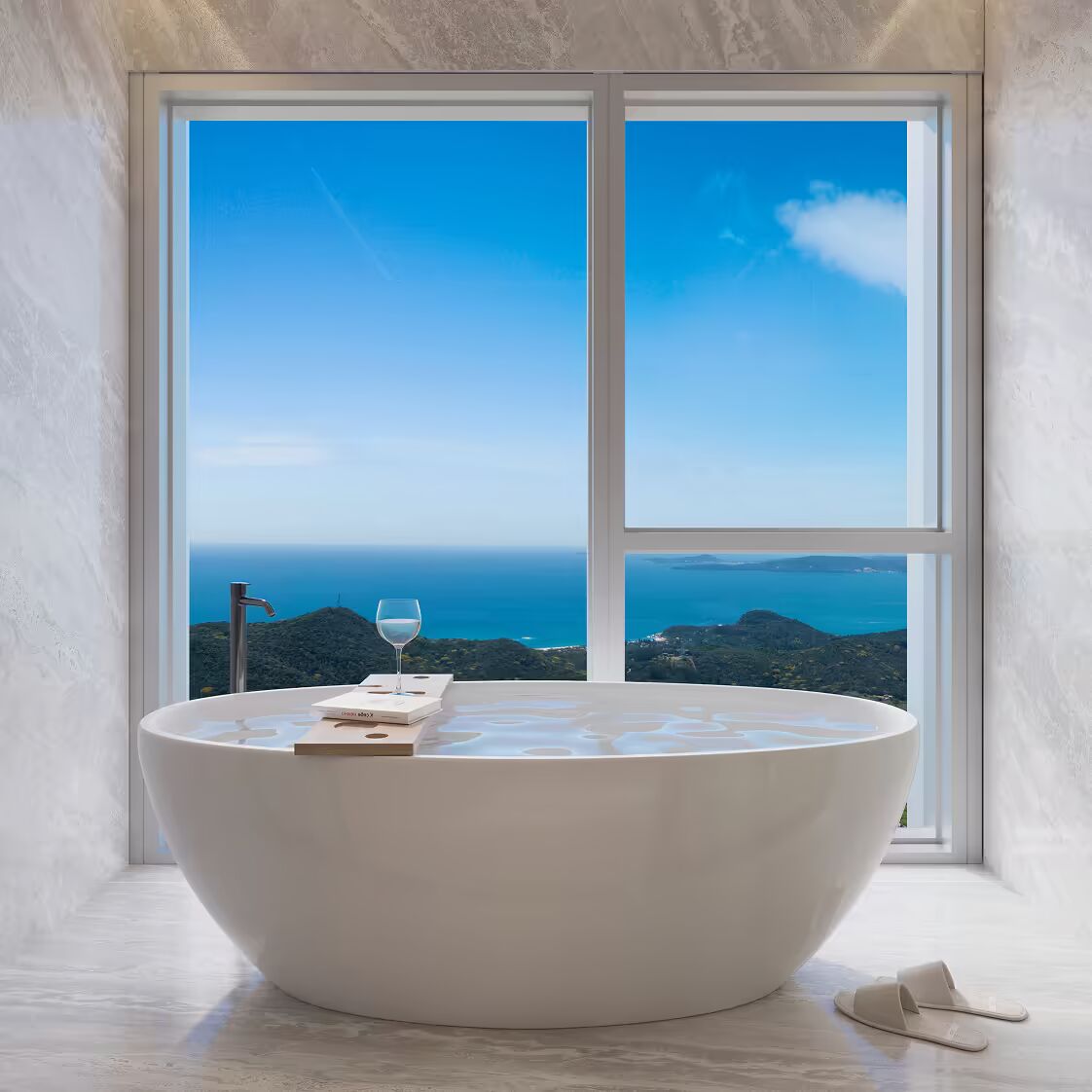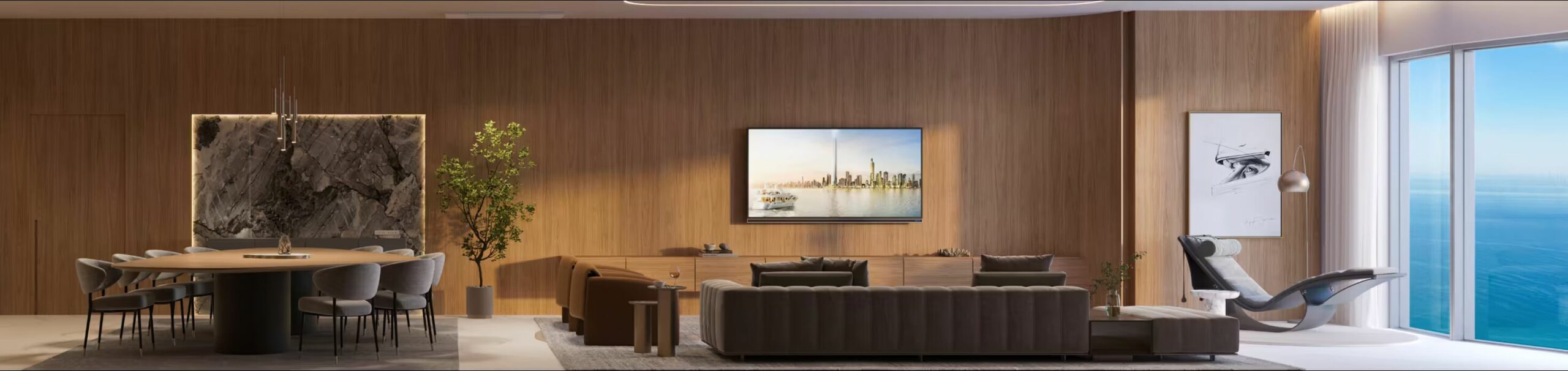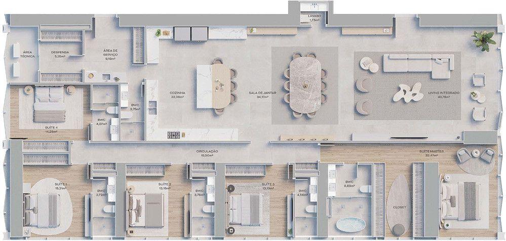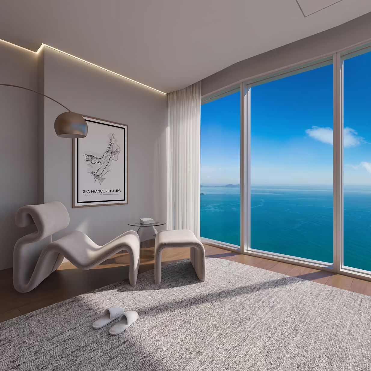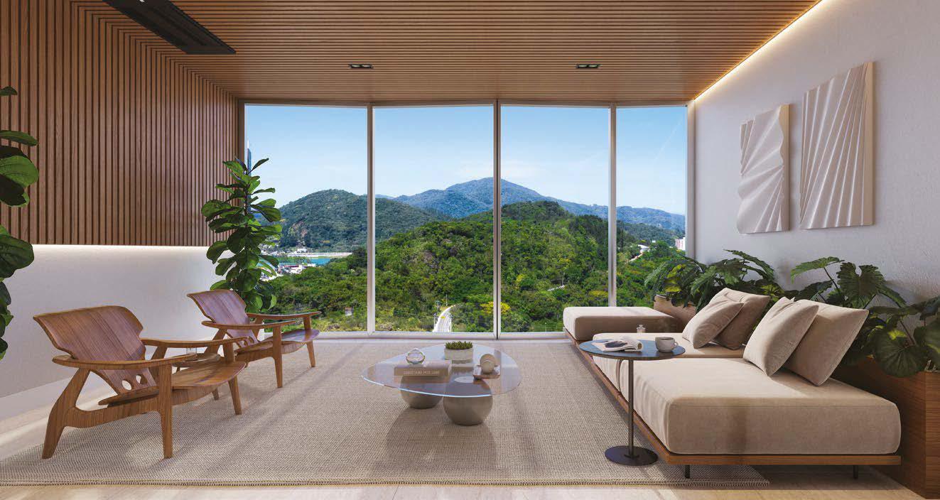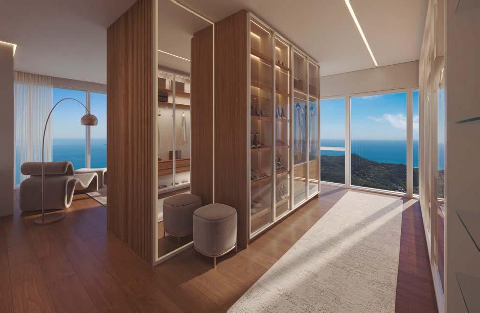 Os apartamentos do Senna Tower possuem metragens entre 300 m² e 400 m², com 5 suítes, incluindo uma master frente mar com sala de banho e banheira de imersão. A planta prioriza integração e amplitude, com janelas amplas que valorizam a vista para o oceano e a Mata Atlântica. Os ambientes contam com acabamentos de alto padrão e distribuição funcional que reforça conforto, privacidade e luminosidade natural.