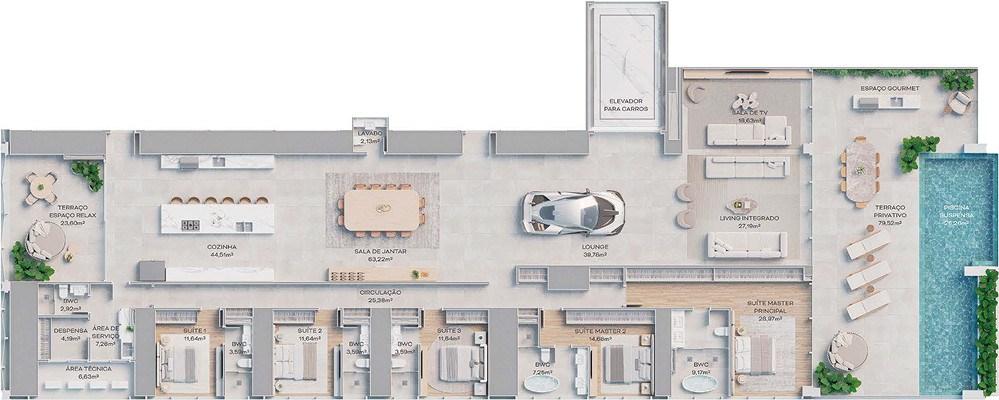 As mansões suspensas do Senna Tower apresentam metragens entre 420 m² e 563 m² privativos, distribuídas em plantas amplas com 5 suítes, incluindo uma master frente mar com sala de banho e banheira de imersão. Cada unidade conta com piscina em balanço com vista para o oceano, terraço privativo e elevador exclusivo para carros. Os ambientes foram projetados para oferecer amplitude, iluminação natural e integração entre as áreas sociais, combinando acabamentos sofisticados e uma experiência residencial única em altura.