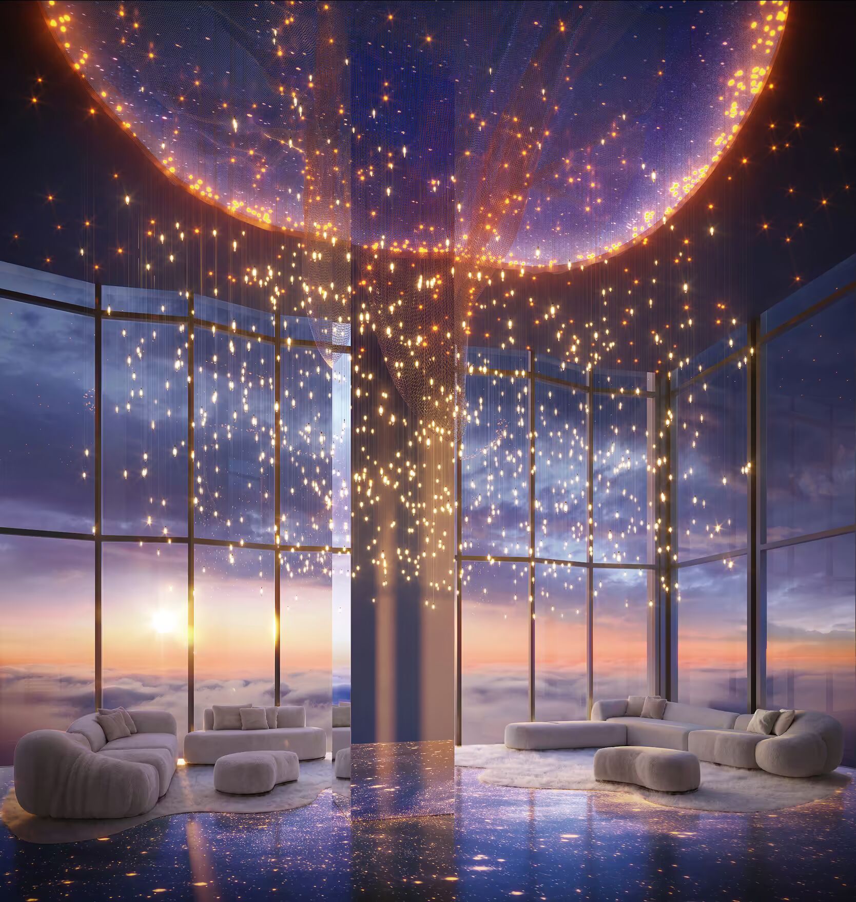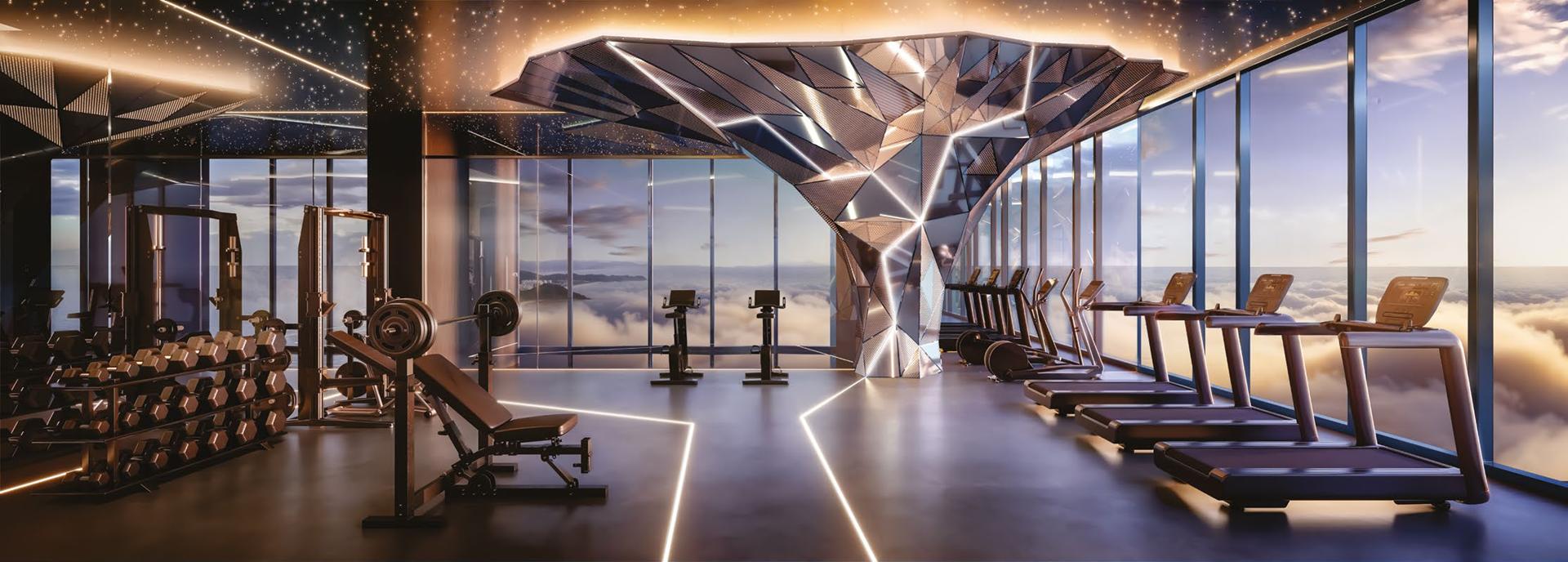 A torre possui mais de 6.000 m² de lazer em seis andares, incluindo restaurantes, piscinas suspensas, áreas de spa, wine bar, brinquedoteca, quadra, salões de festas e espaços exclusivos como kart experience e mirante elevado.