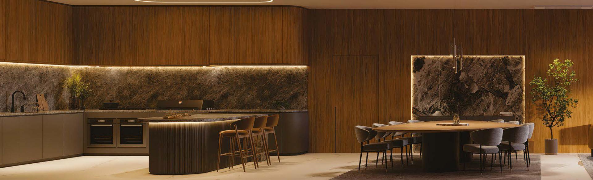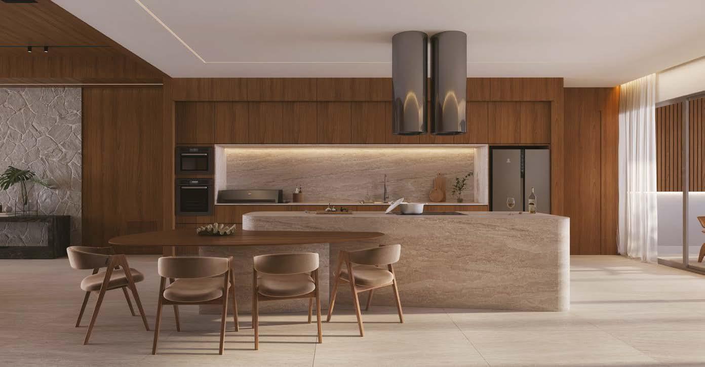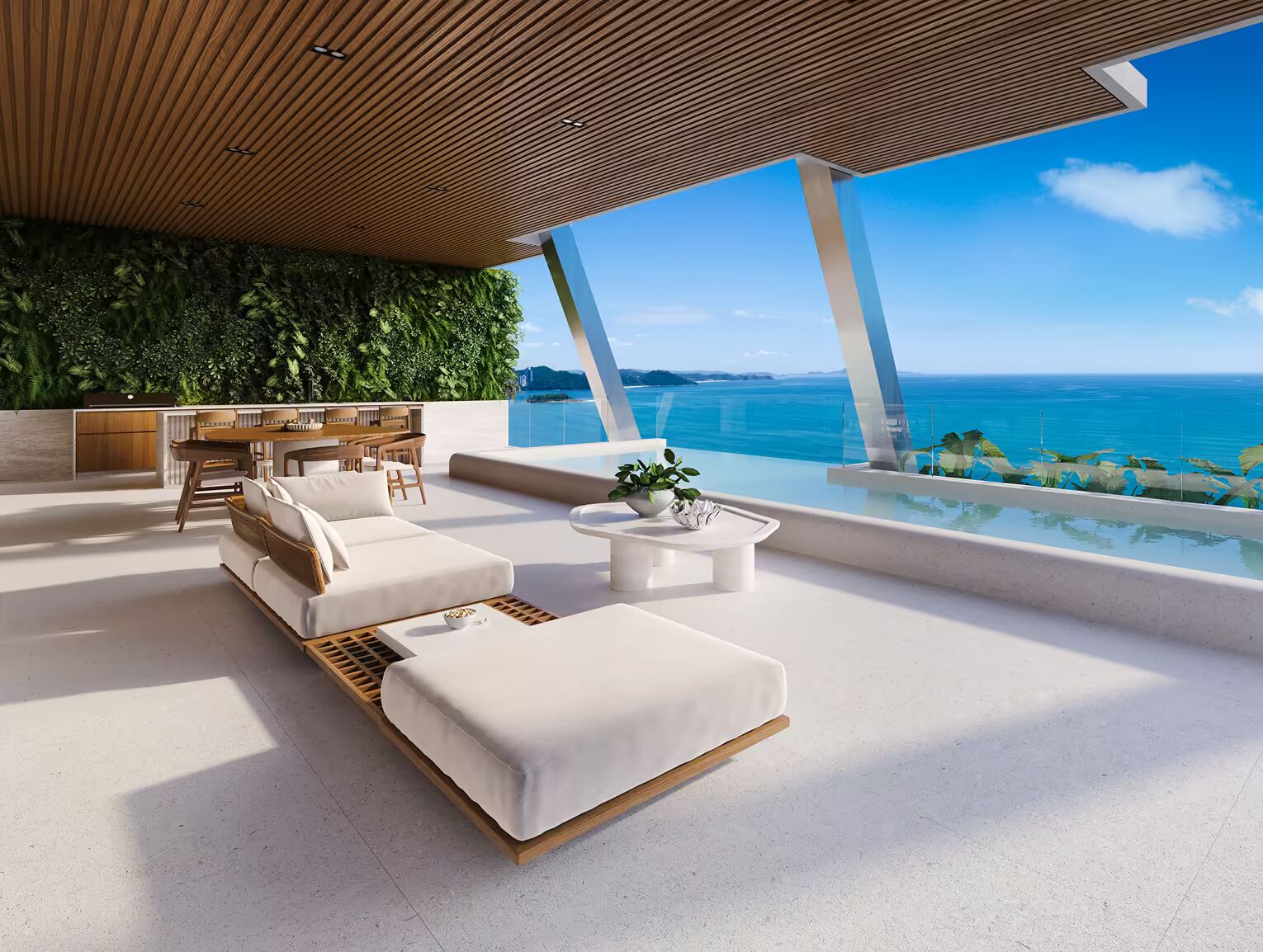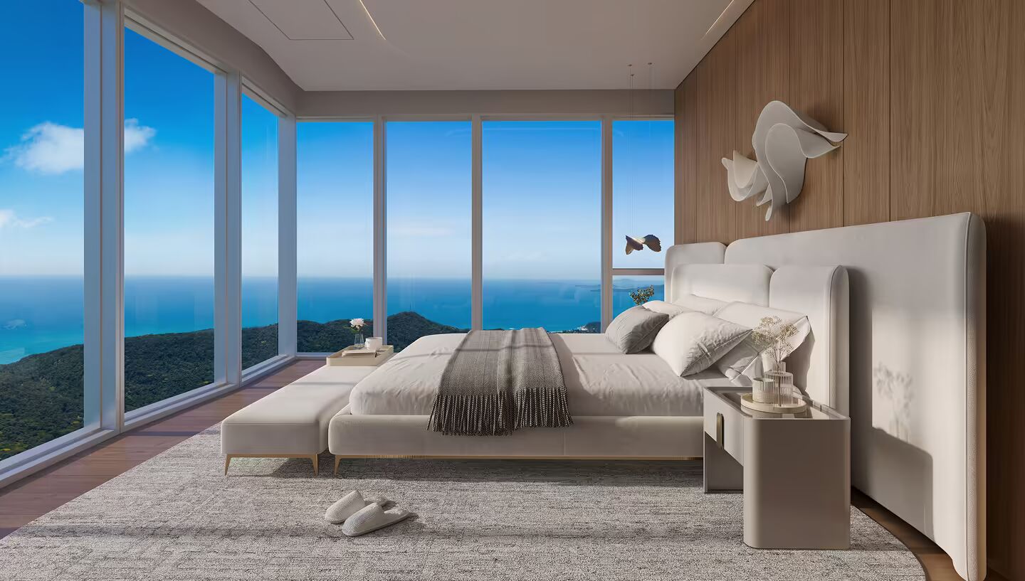 O empreendimento conta com apartamentos de 300 m² a 400 m², mansões suspensas entre 420 m² e 563 m² e coberturas de 600 m² e 903 m². As unidades possuem 5 suítes, incluindo master frente mar, além de opções com piscina suspensa e elevador para carros, dependendo da tipologia.