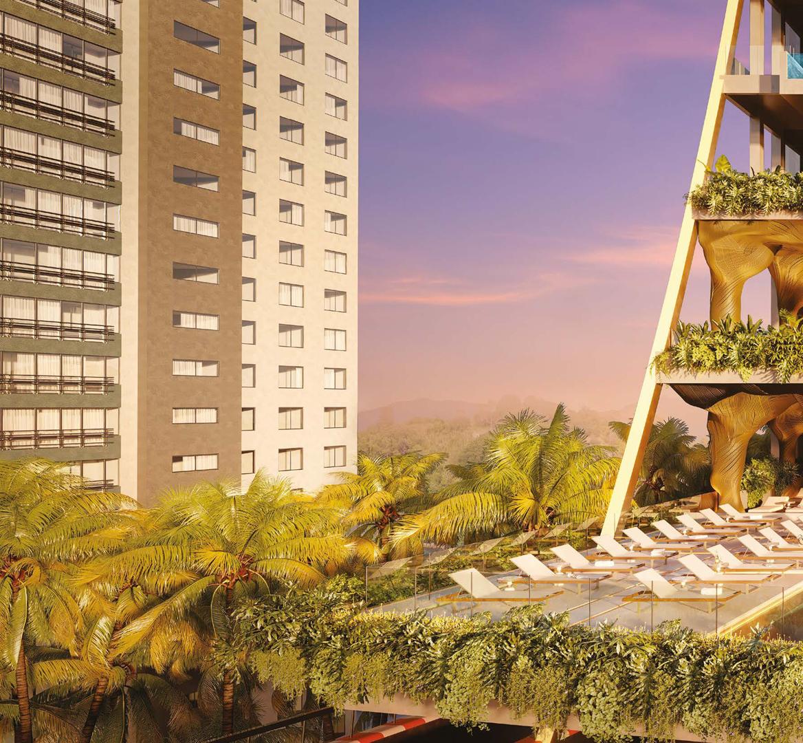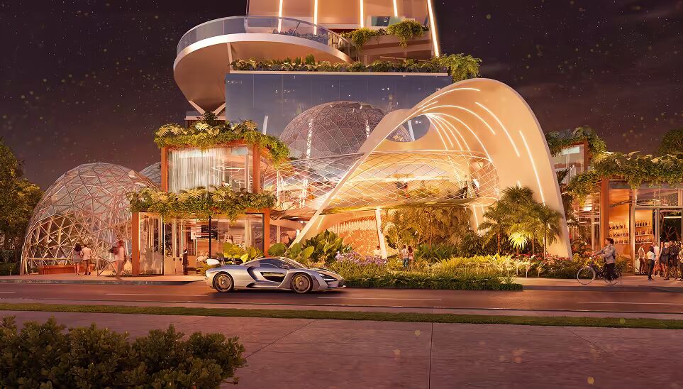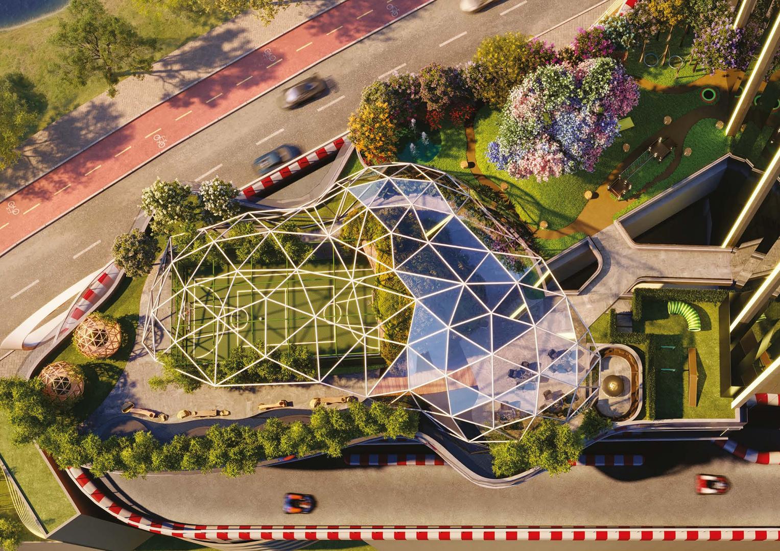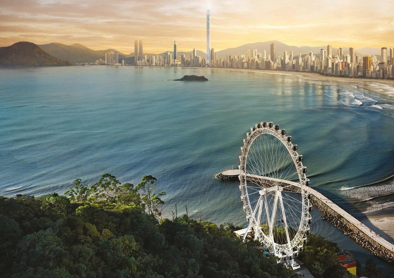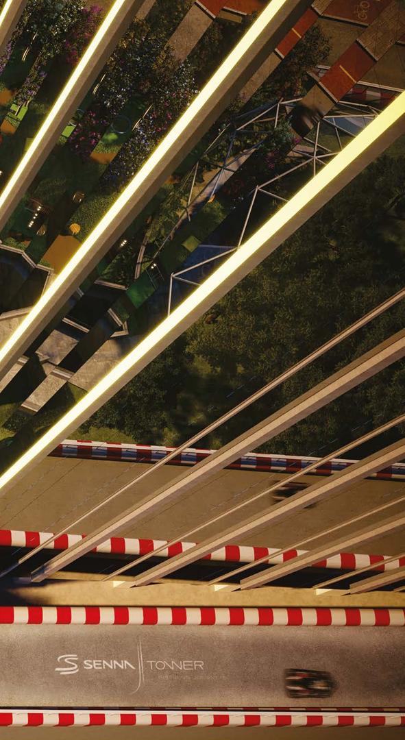 O empreendimento traz piscinas suspensas, spa a 212 metros, kart experience, festa a 464 metros, elevador para carros nas mansões suspensas, tecnologia para mitigação de ventos e design assinado por integrantes da família Senna.