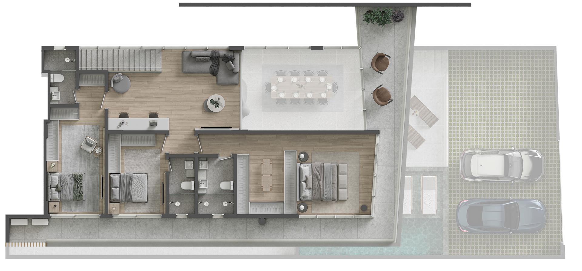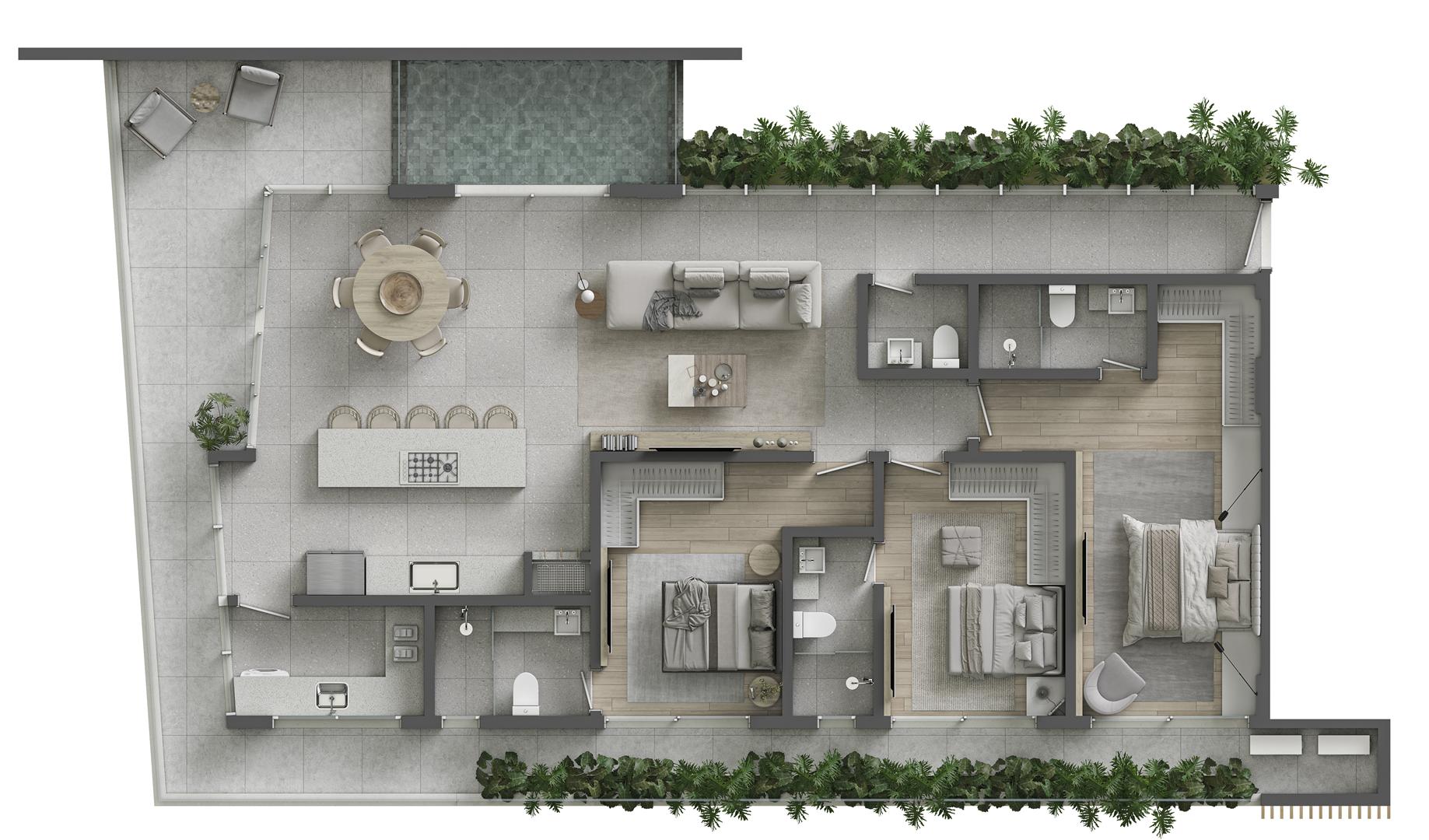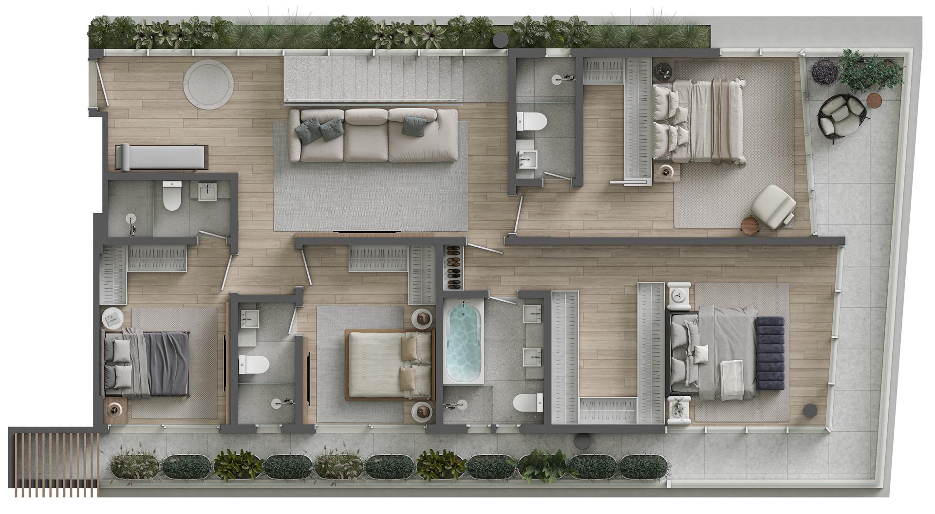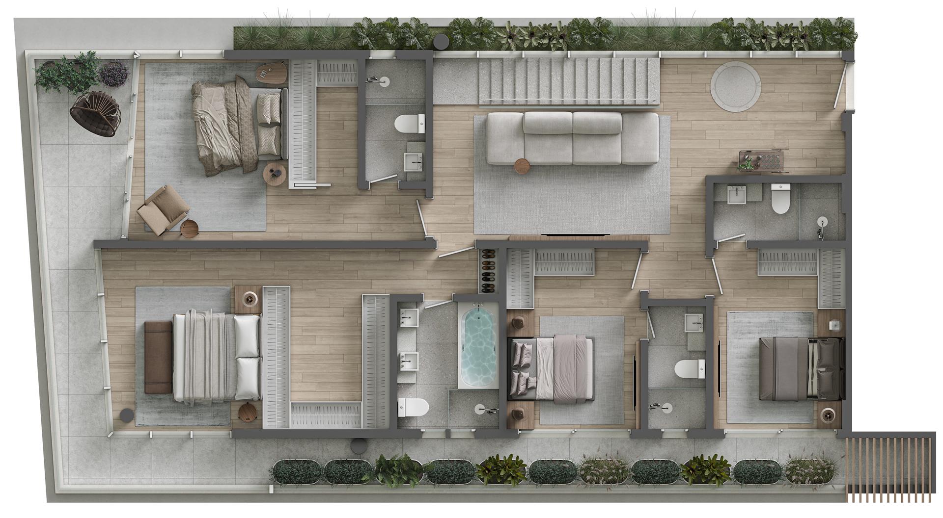 Os apartamentos garden duplex do Sense são verdadeiras casas suspensas frente mar, com metragens de 344 m² e 419 m². As unidades oferecem 4 suítes, amplas varandas, living integrado, piscina privativa aquecida e vista permanente para o mar. São residências exclusivas que combinam amplitude, conforto e sofisticação, com integração total entre os pavimentos e acabamentos de alto padrão.