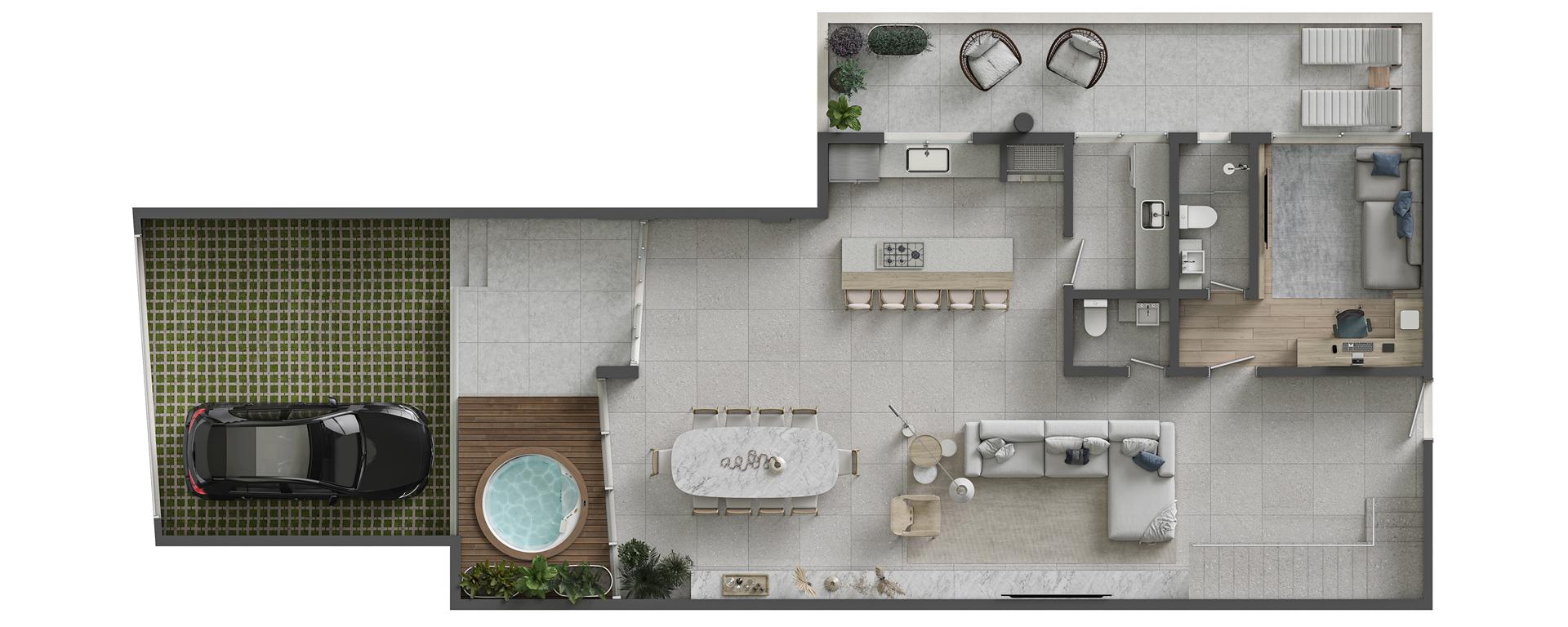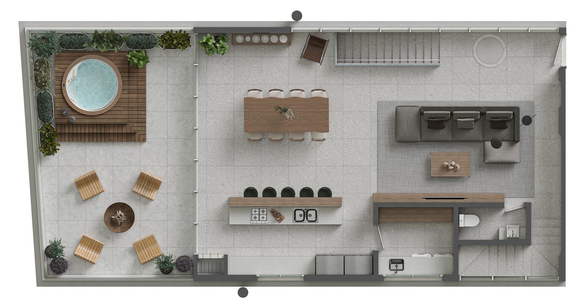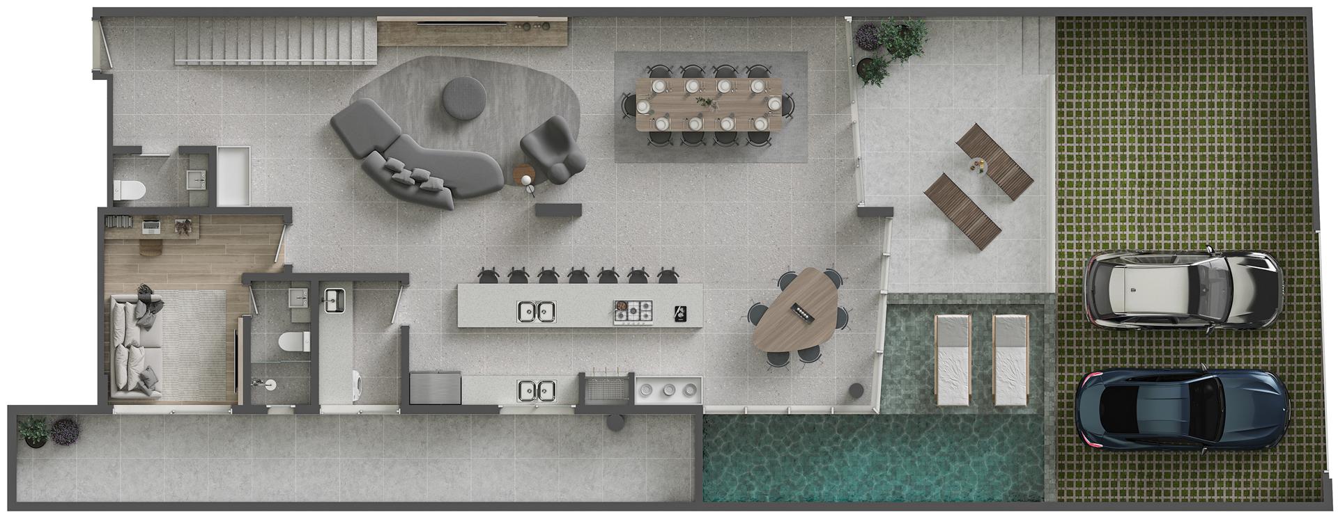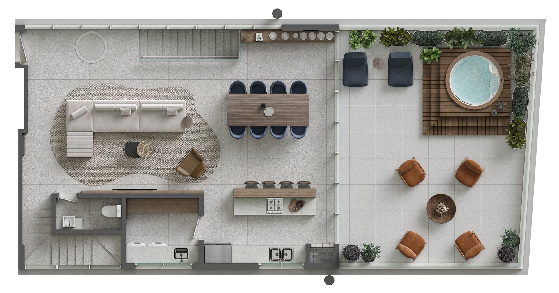 Os apartamentos garden duplex do Sense são verdadeiras casas suspensas frente mar, com metragens de 344 m² e 419 m². As unidades oferecem 4 suítes, amplas varandas, living integrado, piscina privativa aquecida e vista permanente para o mar. São residências exclusivas que combinam amplitude, conforto e sofisticação, com integração total entre os pavimentos e acabamentos de alto padrão.