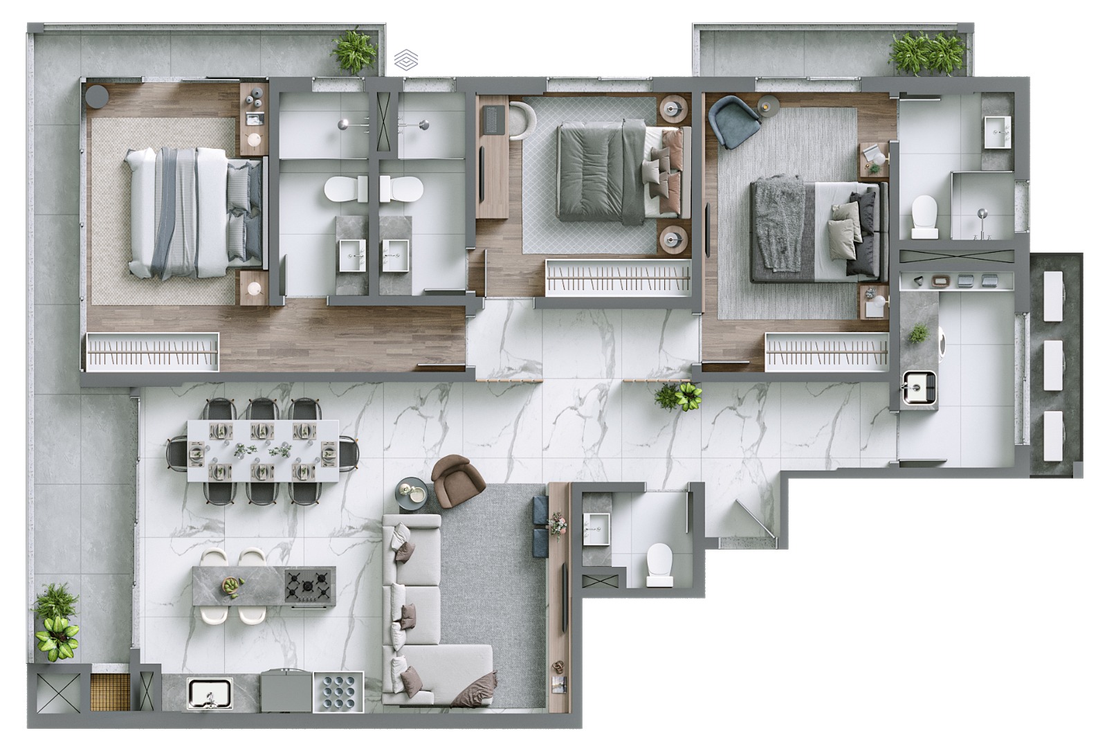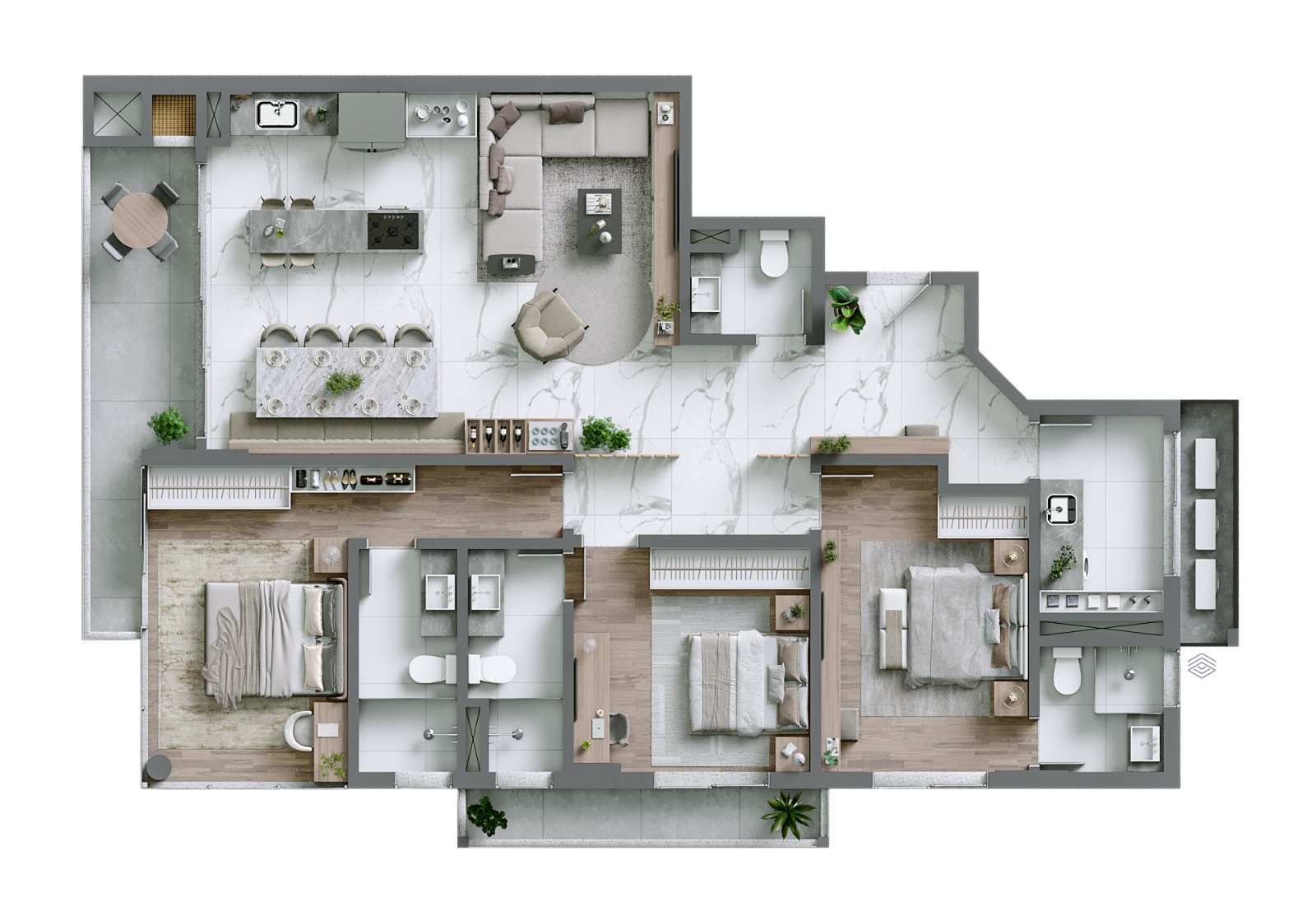 Os apartamentos tipo do Serena Residencial possuem metragens que vão de 126 m² a 133 m², todos com 3 suítes, 2 vagas de garagem e vista privilegiada para o mar. As sacadas com churrasqueira a carvão e o design integrado da área social valorizam o conforto e a praticidade.