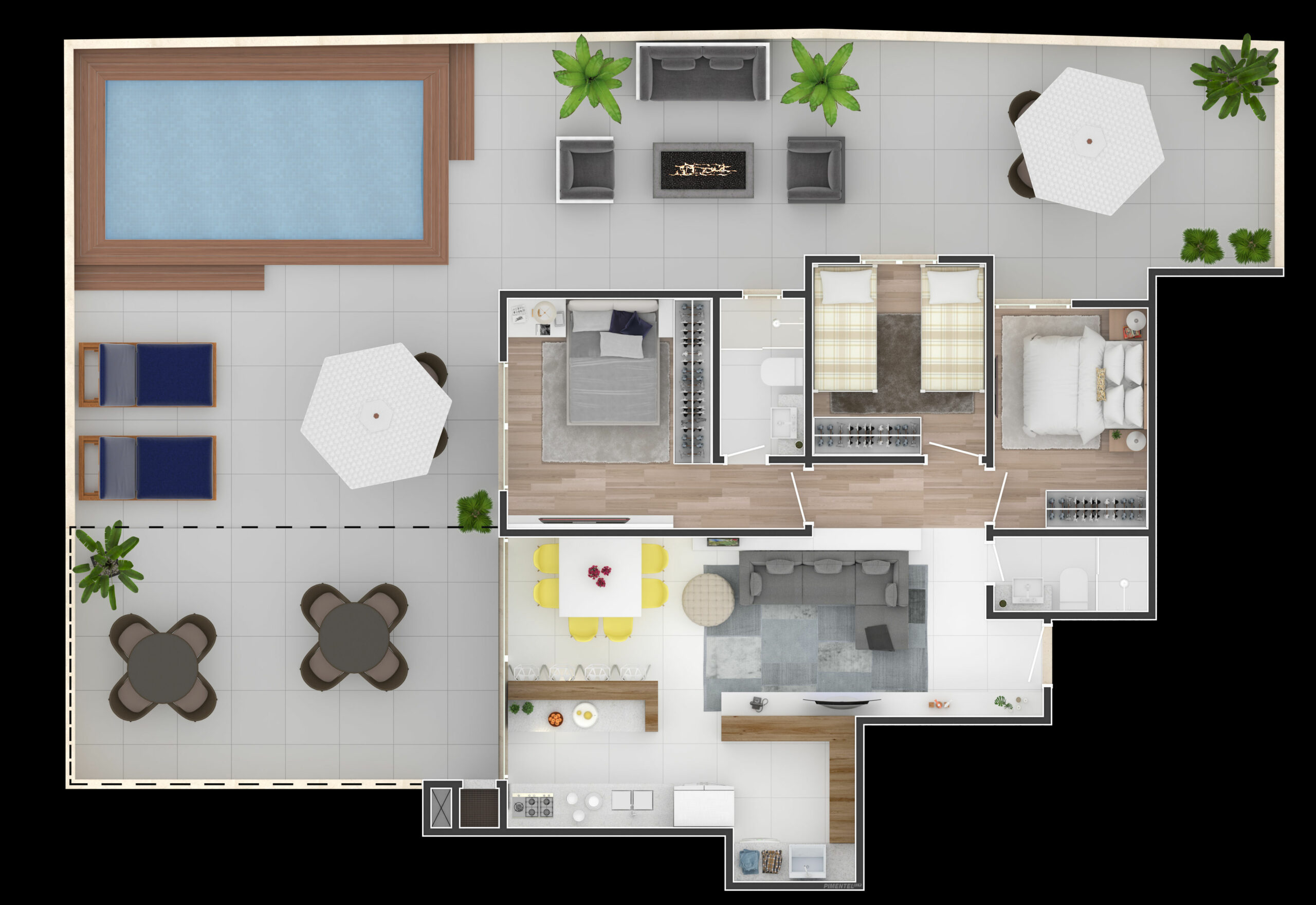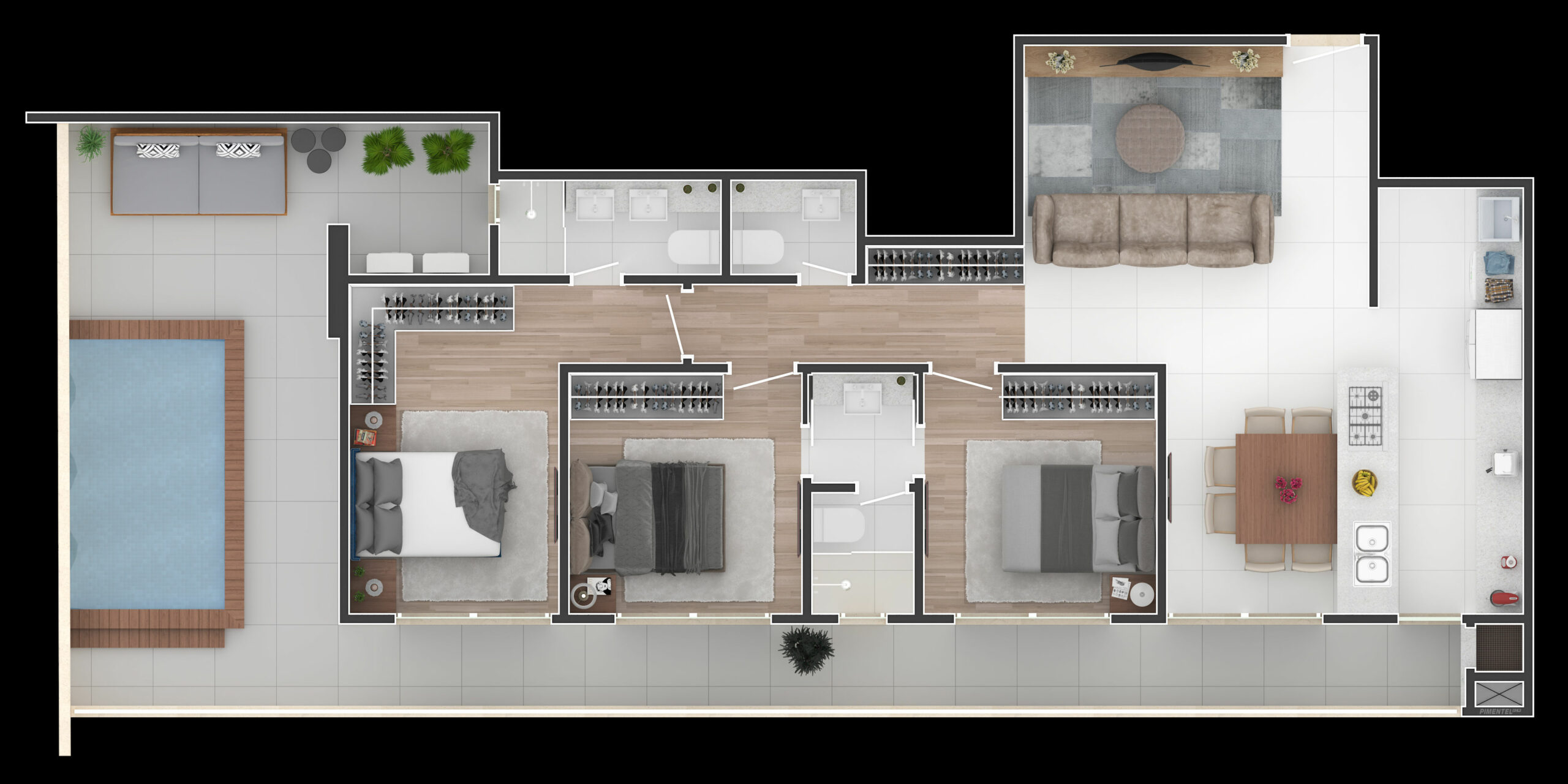 As coberturas do Sun Coast são o destaque do empreendimento, com plantas amplas de até 302 m². Possuem terraço privativo, piscina, churrasqueira e vista panorâmica para o mar. Os acabamentos seguem o mesmo padrão de excelência das demais unidades, com materiais nobres e infraestrutura completa para conforto e automação residencial.