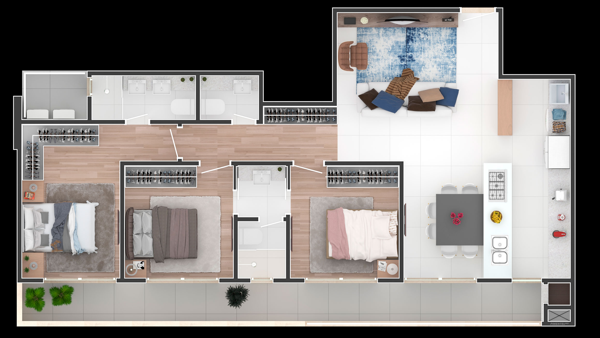 As unidades garden do Sun Coast oferecem espaços amplos e integrados, com metragens superiores e áreas externas privativas. São ideais para quem busca o conforto de um apartamento aliado à sensação de viver em uma casa. Contam com churrasqueira, lavabo, piso vinílico e infraestrutura para água quente e automação.