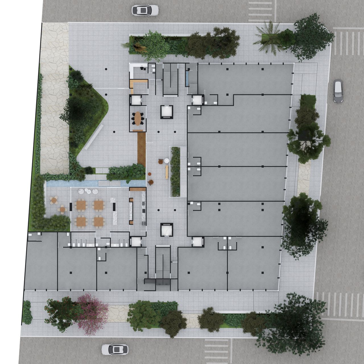 Há um espaço pet com paisagismo e bica exclusiva para os animais de estimação.