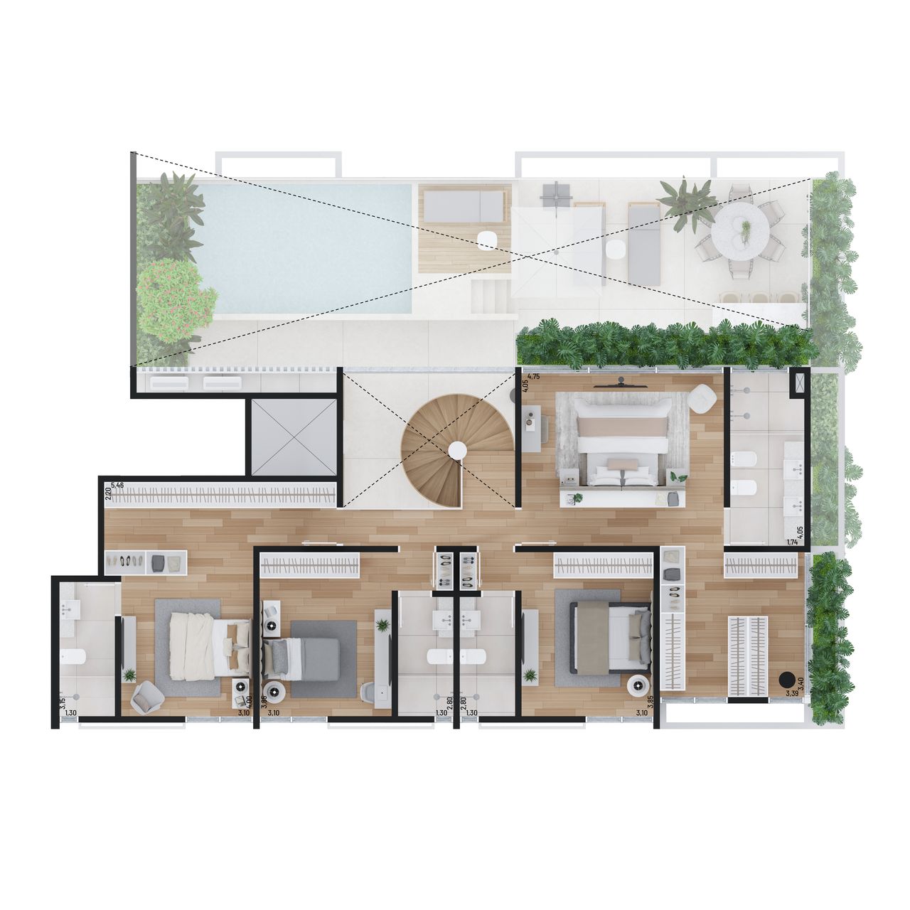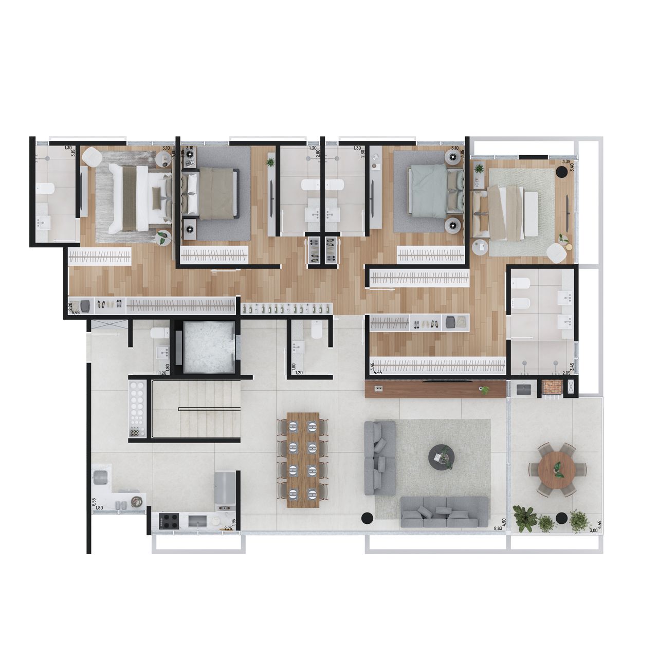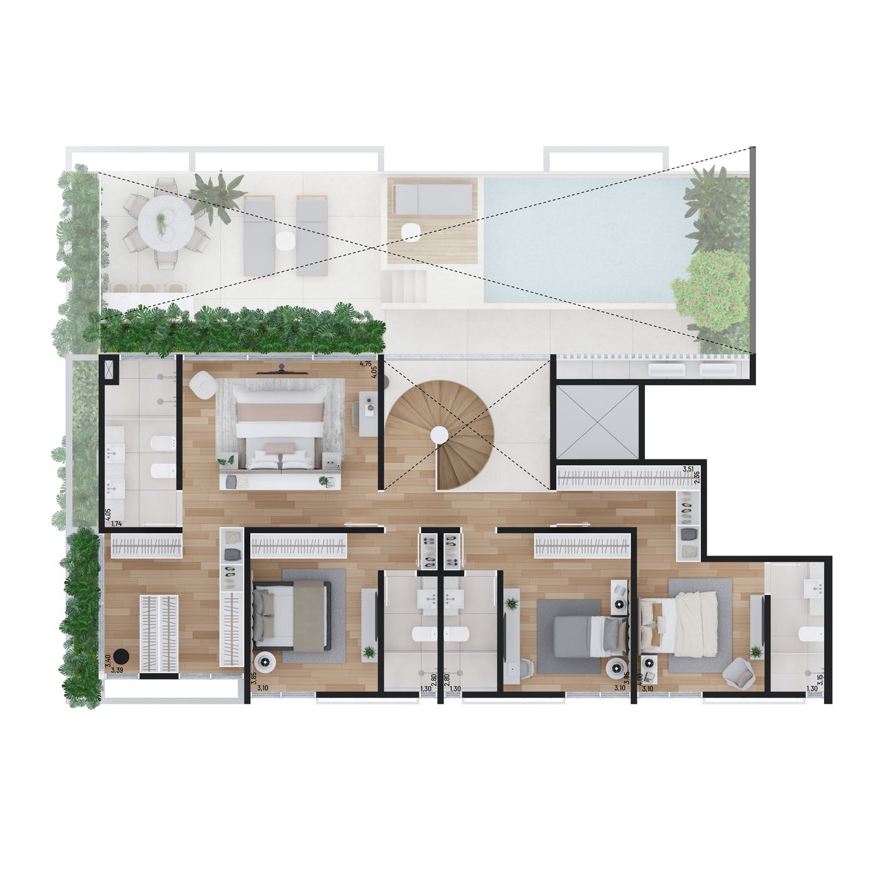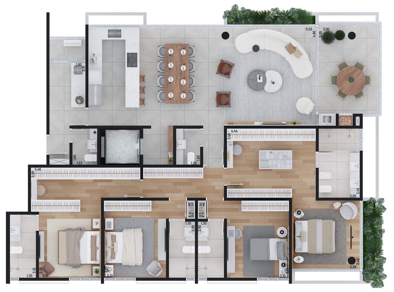 O Vero oferece apartamentos e coberturas duplex, com 4 dormitórios e 4 suítes, com áreas privativas que variam de 209 m² a 408 m².