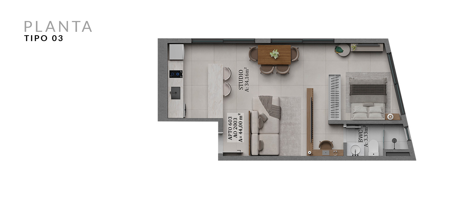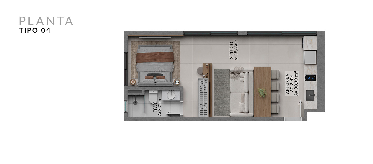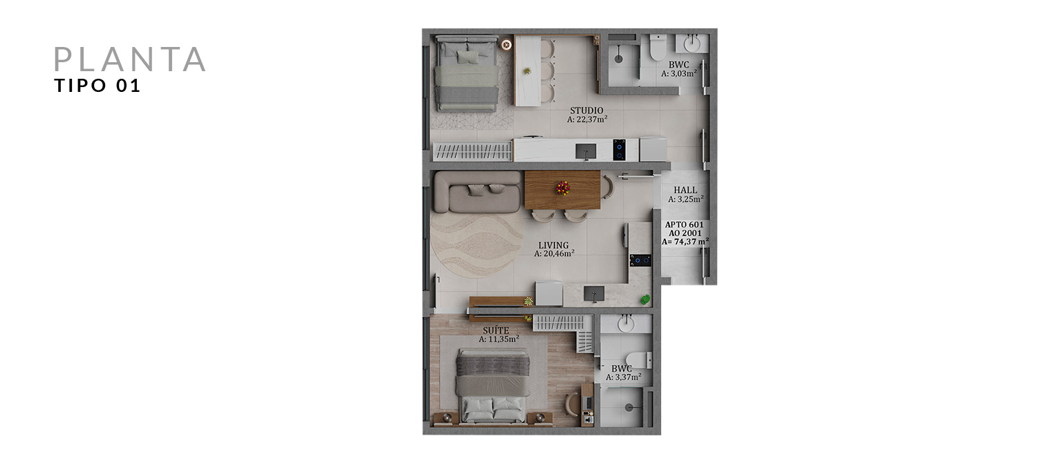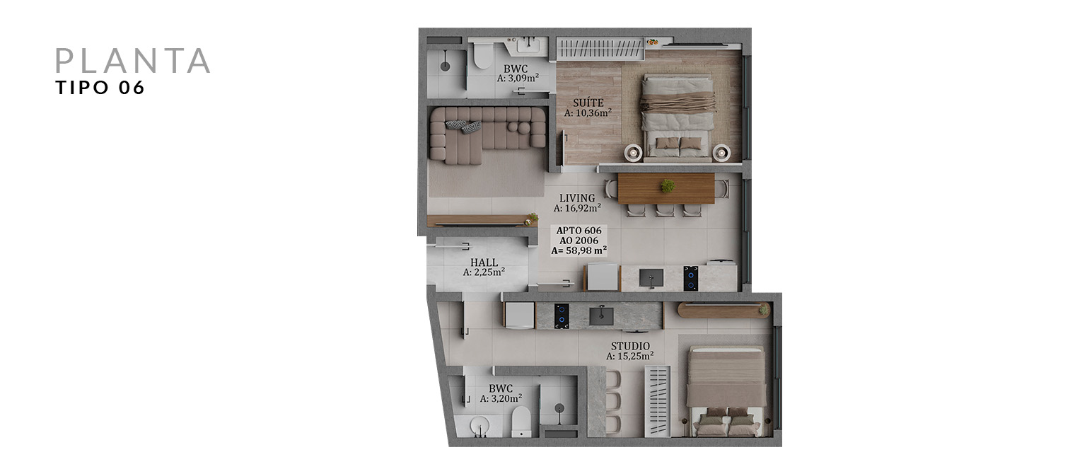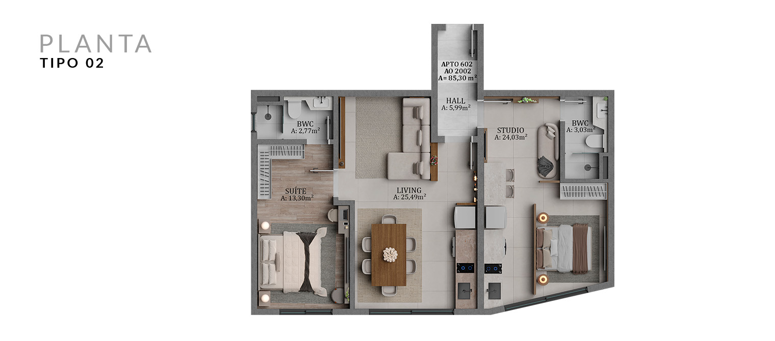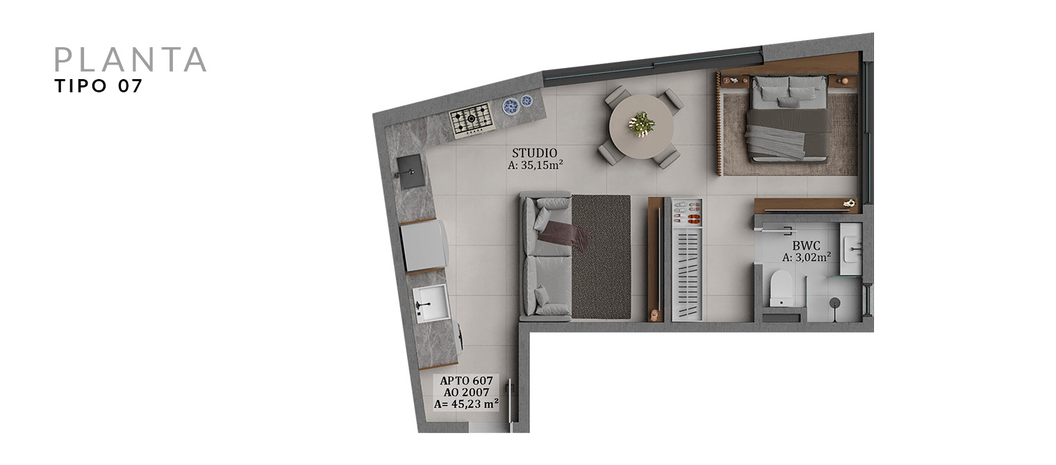São unidades Studio e Studio + Dormitório em 7 plantas, entre 38 m² e 85 m².