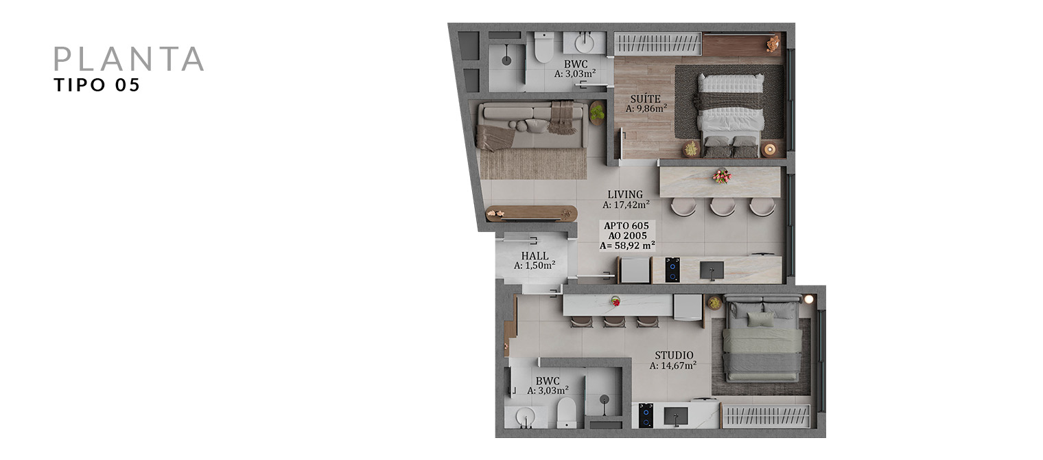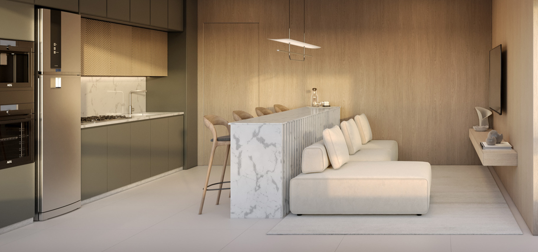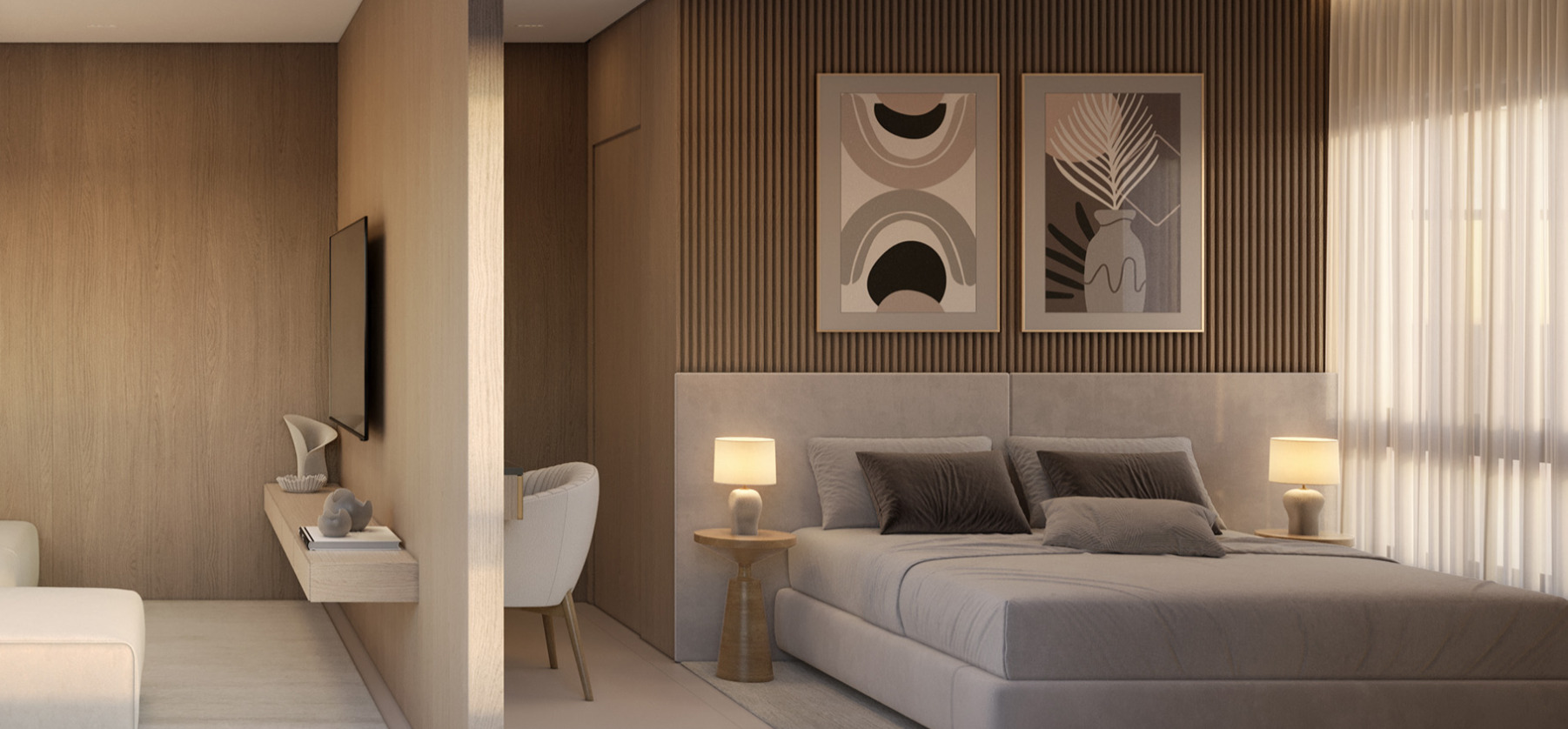 Os apartamentos contemplam tipologias Studio e Studio + Dormitório, distribuídas em 7 plantas, privilegiando integração, circulações curtas e mobiliabilidade versátil, com metragens de 38 m² a 85 m² e 01 vaga por unidade. A configuração favorece uso diário, renda por locação e segunda moradia de praia.
